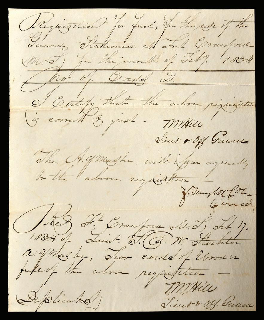 Zachary Taylor Handwritten and Signed Military Requisition for fuel at Fort Crawford, dated 1834, signed “Z.Taylor, Col. Comd.”, 9-3/4 x 7-1/2 in., folds, foxing, toning