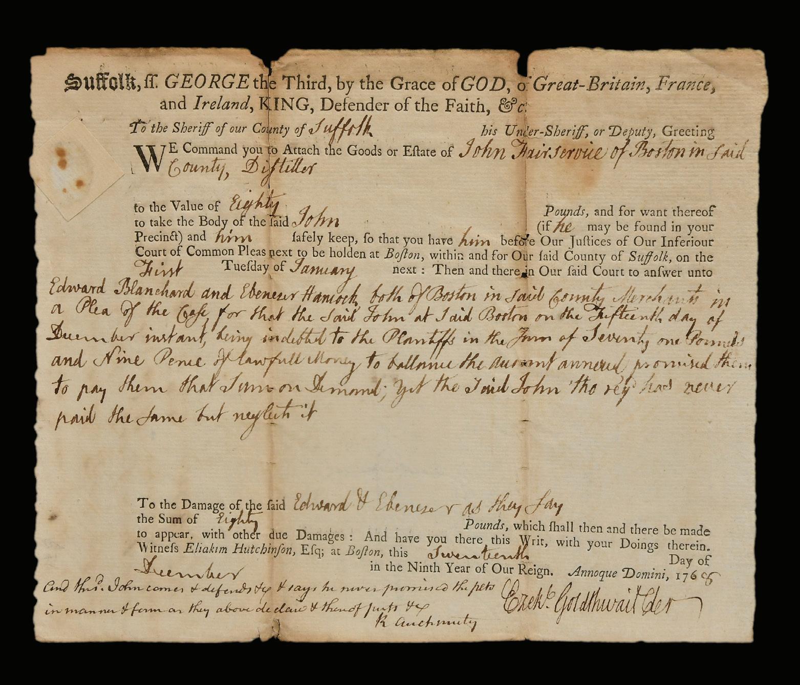 Early John Adams Signed Court Document, 1768 [Suffolk County] December 20, 1768, court proceeding concerning Boston merchants Edward Blanchard and Ebenezer Hancock over a matter of “eighty pounds”, with Ezekiel Goldthwait as Court Clerk, signed “Adams”, 6-1/2 x 8 in., delicate throughout, foxing, toning, deep folds and splits with partial separations, could possibly benefit from professional restoration