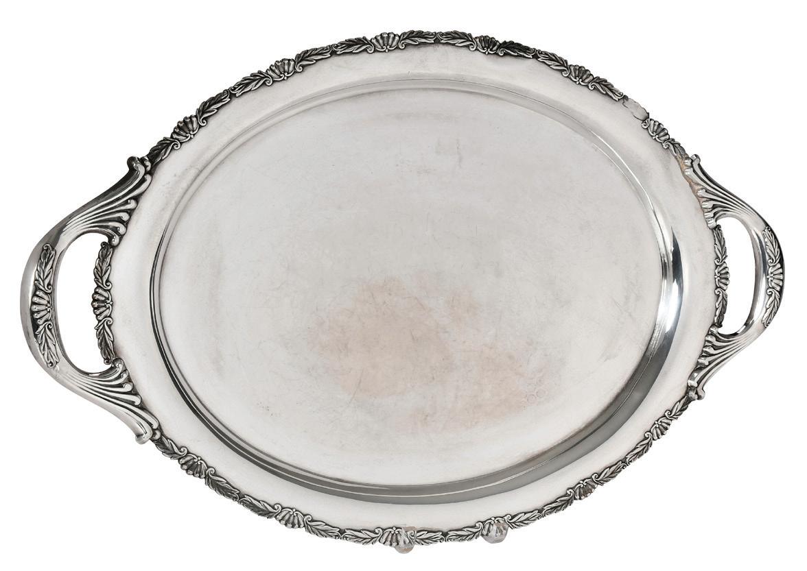 Large Sterling Two Handle Tray with Case probably Japanese, 20th century, oval applied scroll and shell decoration, two handles, no monograms, marked 950 and “S” in a circle, 81.66 oz. T., 1-1/2 x 27-3/4 x 17-1/2 in.; with fitted case, 2 in. rim dent, missing 1-1/4 in. of the applied border, light scratches, and typical wear