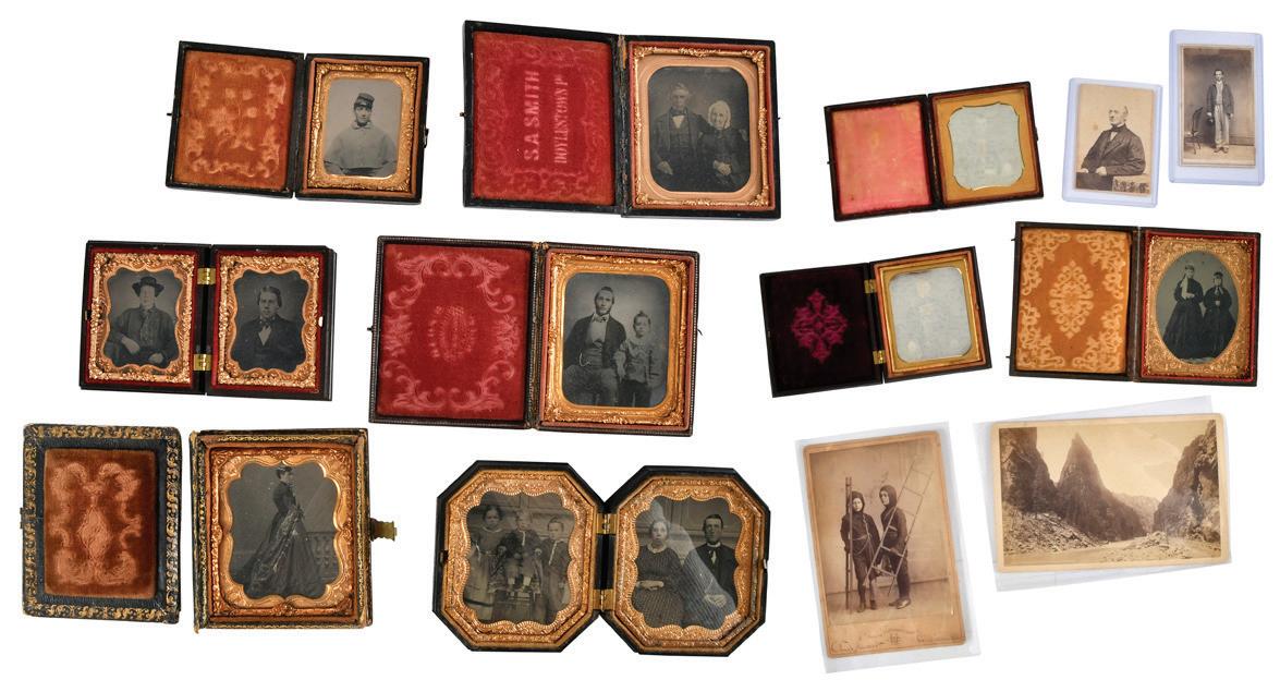 four loose photographs: abolitionist William Lloyd Garrison, “occupational” showing children working as chimney sweeps, Rocky Mountain landscape, and one man with hands at side; nine small daguerreotypes/ambrotypes in cases: Union soldier and a collection of as yet unidentified men, women, and children, a few with applied rose to cheeks; largest 7 x 4-1/2 in., good overall with expected fading or discoloration, visible wear; some distress to outer boxes with one fully separated (inlaid mother-of-pearl example)