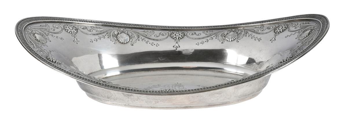 Tiffany Sterling Bread Tray American, 1907-1947, oval with shell and scroll border, monogram, marks for Tiffany & Co., “18198D...6486”, 15.81 oz. T., 3 x 12 x 7-3/4 in., good condition, light wear