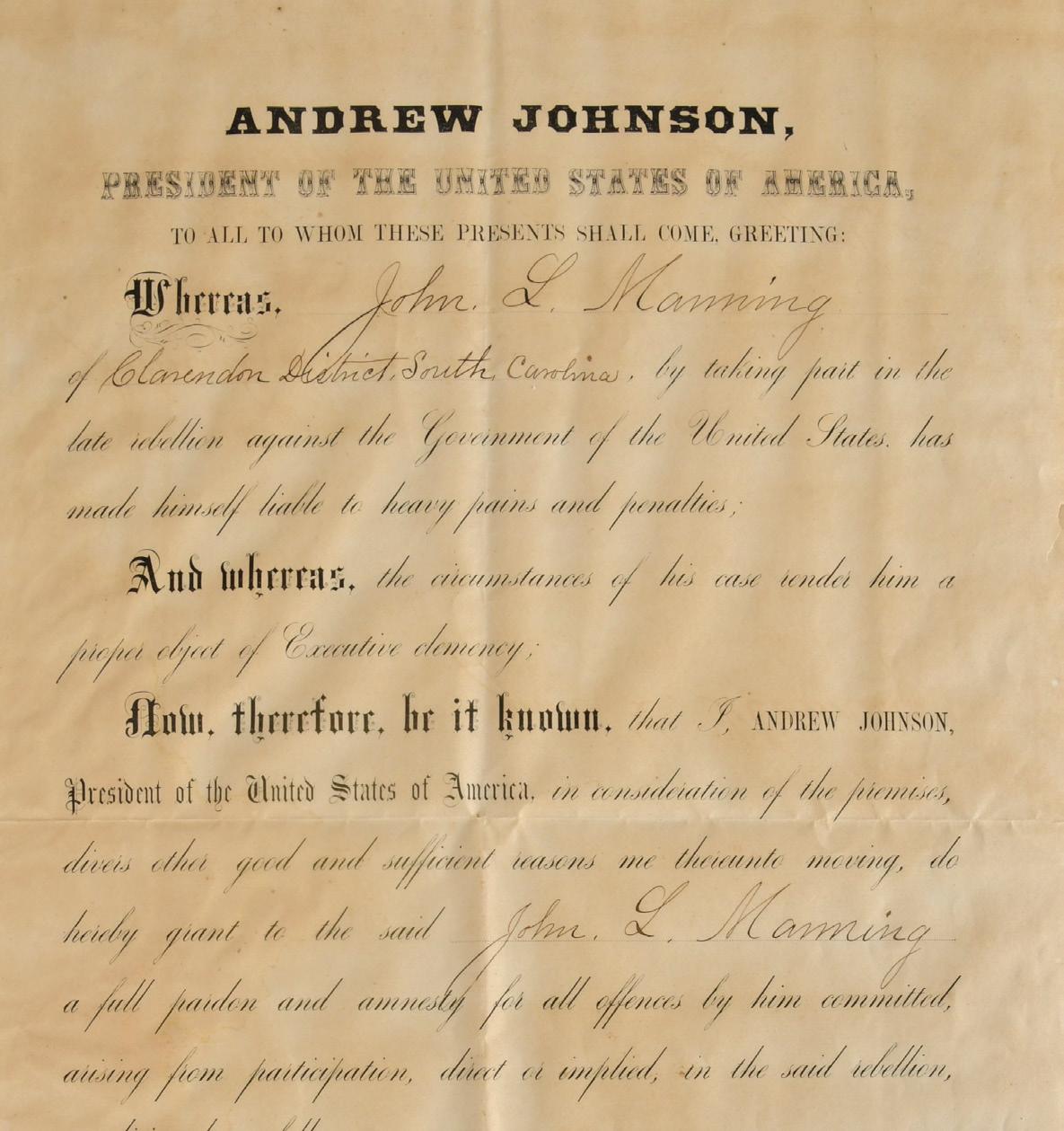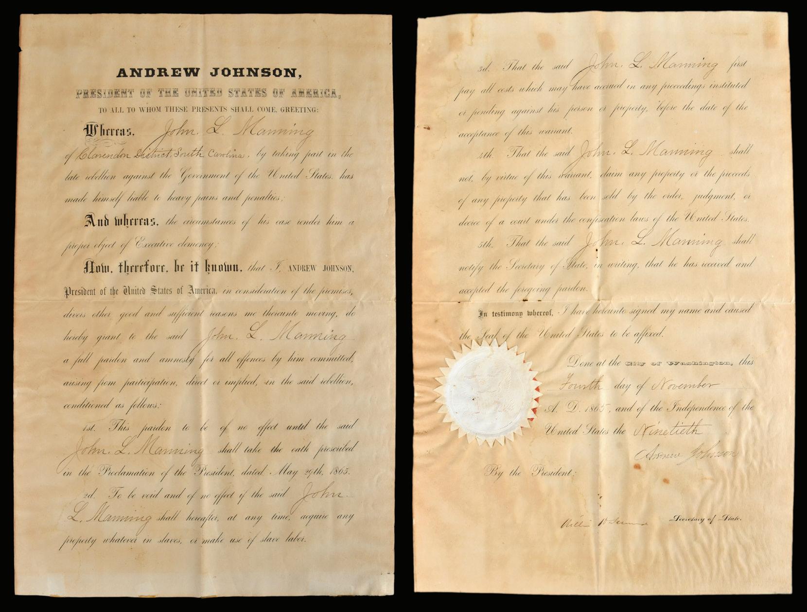 Important Pardon for S.C. Governor John Manning, by President Andrew Johnson, on two separate leaves, dated November 4, 1865, pardon and amnesty for all offences committed by former South Carolina Governor John Manning of the Clarendon District, for his part in the “rebellion against the Government of the United States”, with affixed seal, bearing signatures of President Andrew Johnson and Secretary of State William Seward, 17-1/2 x 11-1/4 in. each leaf, toning, foxing, water stained (most notable at back), pinholes, tape remnants at periphery and back, visually pleasing despite the preceding qualifiers