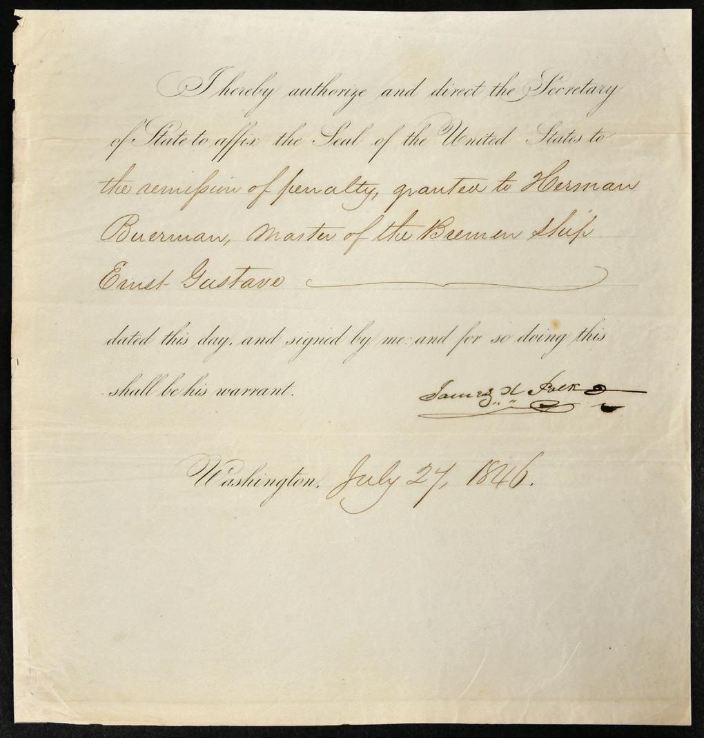 James Polk Signed Official Decree remission of penalty granted for the Shipmaster of the Gustav ship of Bremen, Germany, dated July 27, 1846, on thin folio paper, signed “James K. Polk”, 8-1/2 x 8 in. (folded), toning, mounts present at back, bold signature