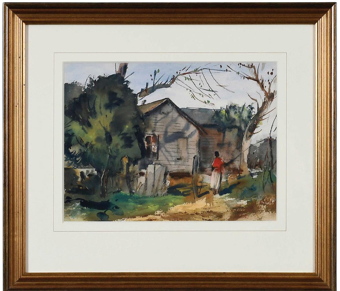 The Red Shirt, unsigned, watercolor on paper, sheet 12 x 16 in.; modern gilt wood frame, 21-1/8 x 24-1/8 x 1-1/4 in., hinged at top corners, remnants of old tape along edges verso, bold color, minor toning; frame with light wear