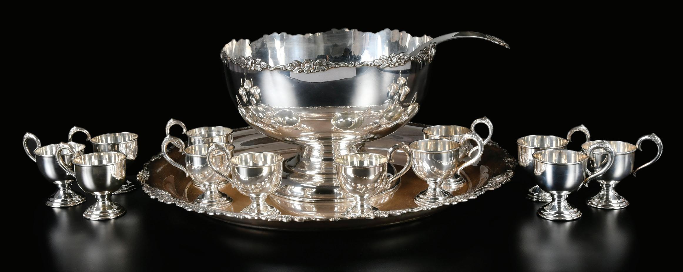 Sterling Punch Bowl, 12 Cups, Ladle, and Tray probably Japanese, 20th century, rose decoration, including footed punch bowl, 8-1/4 x 12 in.; 12 cups, 4 x 4-1/4 in.; double spouted ladle, 131/4 in.; tray, 21 in. with a fitted case, marked 950 and maker’s mark of “S” in a circle, 201.0 oz. T., all with light scratches