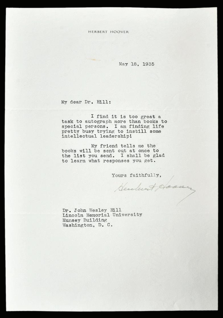 Herbert Hoover Typed Letter Signed on his stationery, 1935, to Dr. John Wesley Hill, mentions autographing books, signed “Herbert Hoover”, 10-1/2 x 7 in., toning, folds, light stain in one area