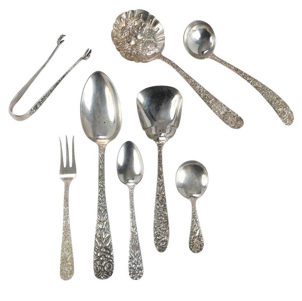 American, 20th century: 27 pieces Kirk & Son Repousse: large stuffing/rice spoon; four ladles; three sugar spoons; bon bon; sugar tongs; two berry spoons; cucumber server; olive fork; six teaspoons; baby spoon; small serving fork; salt spoon; two hollow handle carving sets, seven pieces Steiff Repousse: ladle; serving fork; salad set; fruit spoon; sugar spoon; jelly spoon, 15 pieces Greenwood Bros.: seven serving spoons; eight teaspoons, various makers: sugar spoon; hollow handle cake knife, 72.34 oz. T. excluding hollow handle pieces, 2-1/2 in. to 14-1/4 in., all with wear and damage