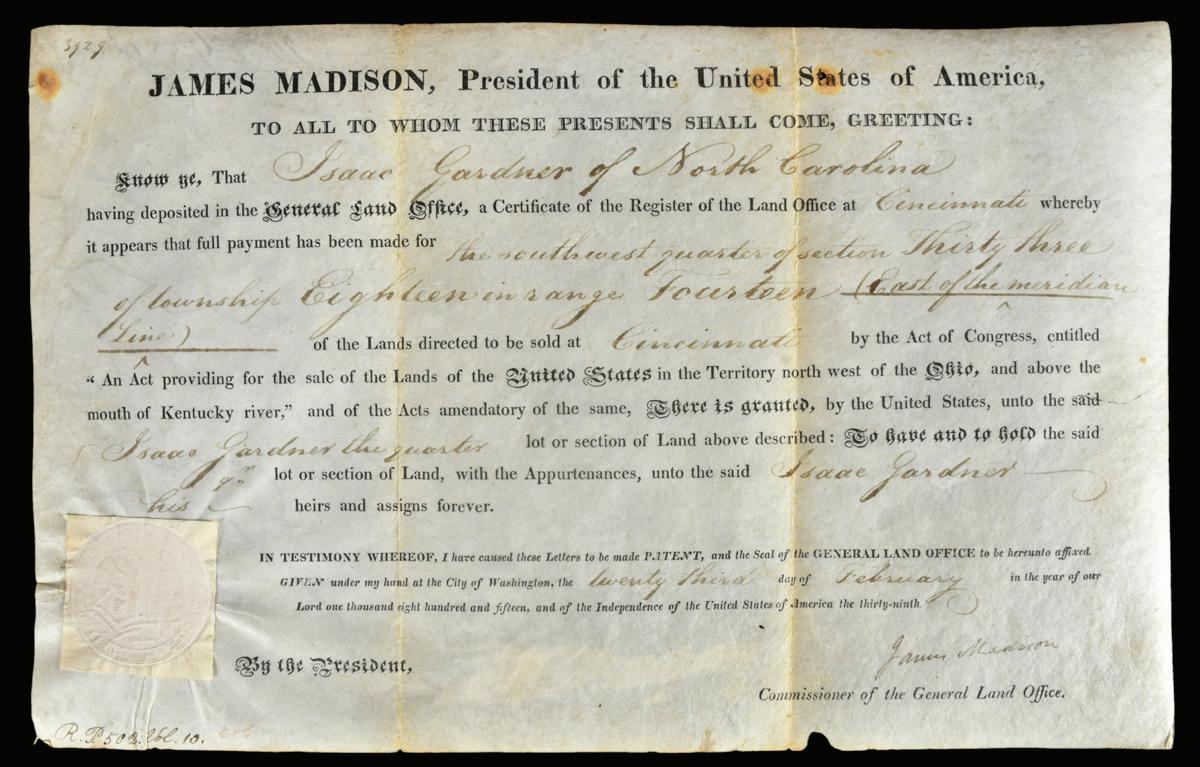 James Madison Signed Ohio Land Grant February 23, 1815 dated land deed issued to Isaac Gardner of North Carolina for land near Cincinnati, Ohio, signed “James Madison”, 8-1/2 x 13-1/2 in., folds, rust stains, periphery losses, area of removed mount at back