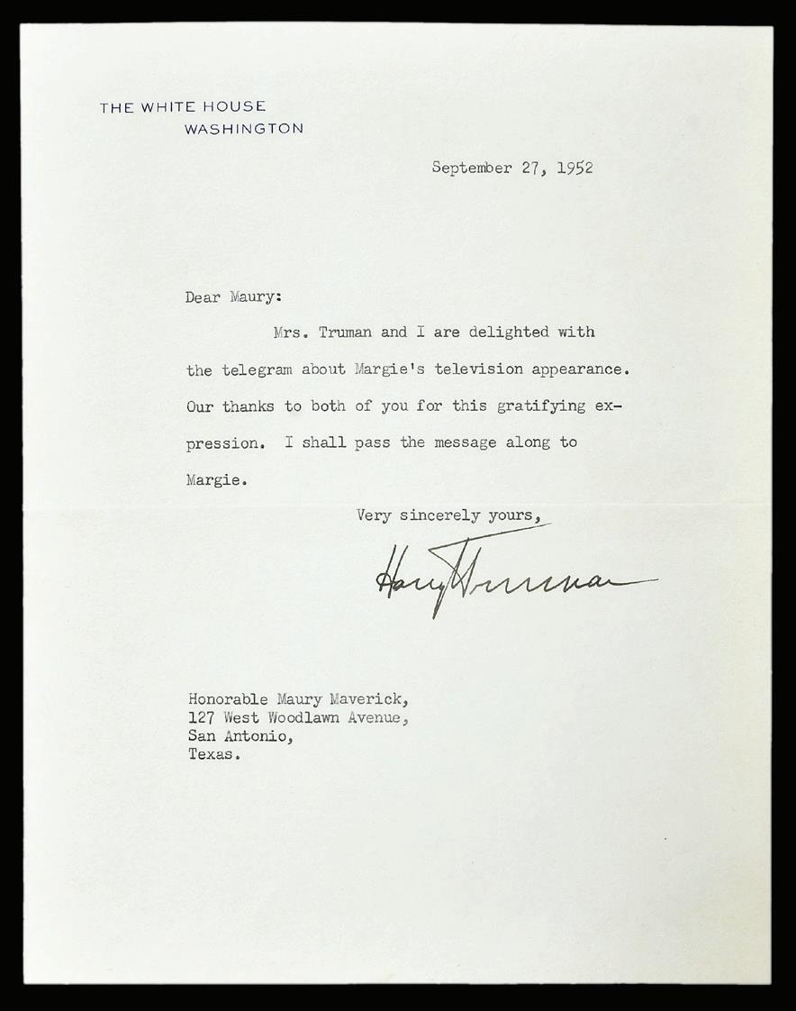 Harry Truman Typed White House Letter Signed on official stationery, to Hon. Maury Maverick of San Antonio, Texas, dated 1952, signed “Harry Truman”, folio, 8-3/4 x 6-3/4 in. (folded), toning, folds