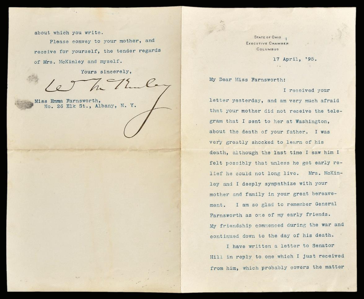 William McKinley Typed Personal Letter Signed letter of condolence to Miss Emma Farnsworth of Albany, New York regarding the death of her father, General John Gosman Farnsworth, April 1895, on Ohio Government letterhead, signed “W. McKinley”, folio, 9 x 11 in. (fully opened), toning, folds, a few stray smudges, nice bold signature