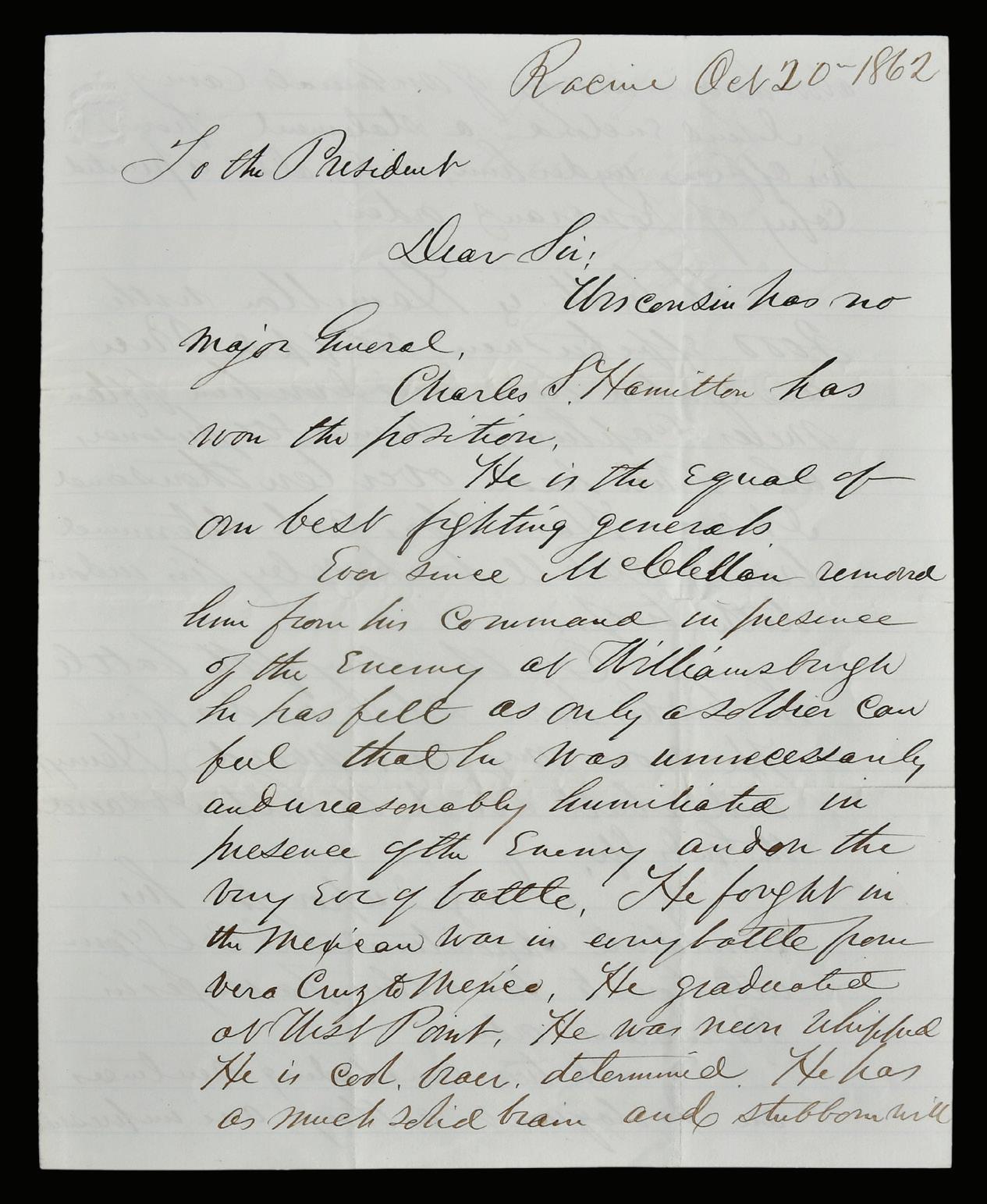Abraham Lincoln Handwritten and Signed Notation, Wartime [Racine, Wisconsin] October 20, 1862, lengthy letter from James R. Doolittle, writing from his Wisconsin home to discuss promotion for Charles Smith Hamilton to Major General, Lincoln’s notation with mention of “...present condition of General Grant’s Army...”, signed “A. Lincoln”, folio, 15-1/4 x 9-1/2 in. fully opened, toning, folds, delicate fold intersections with some daylight showing through, edge splits