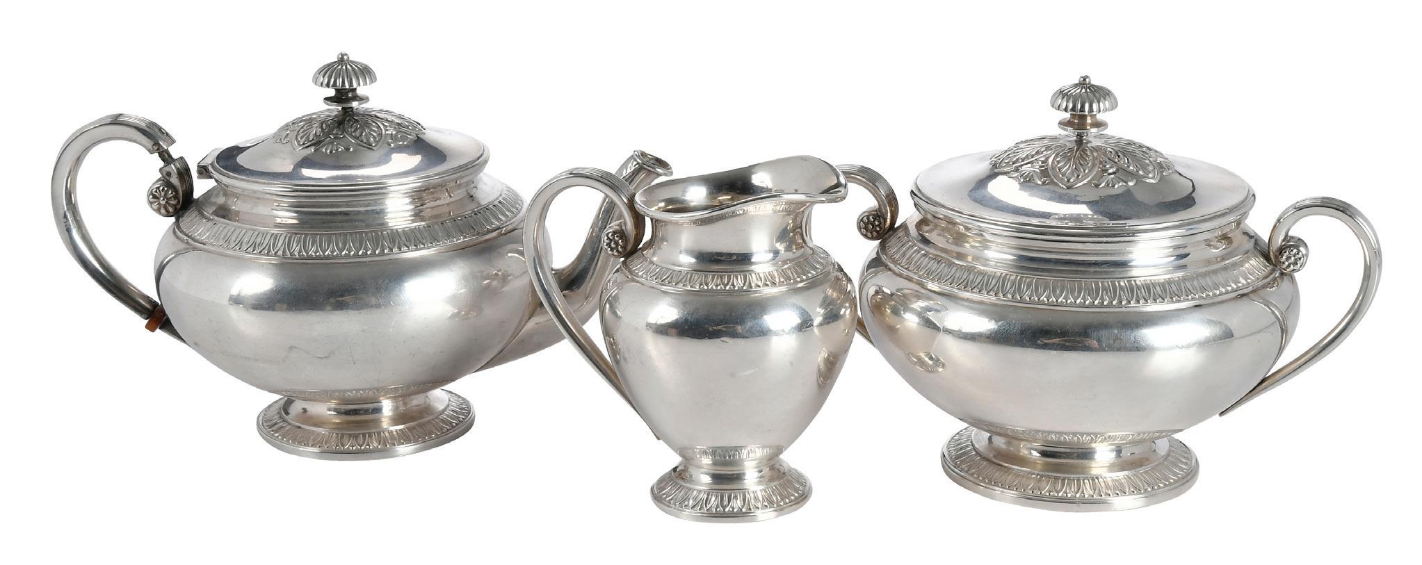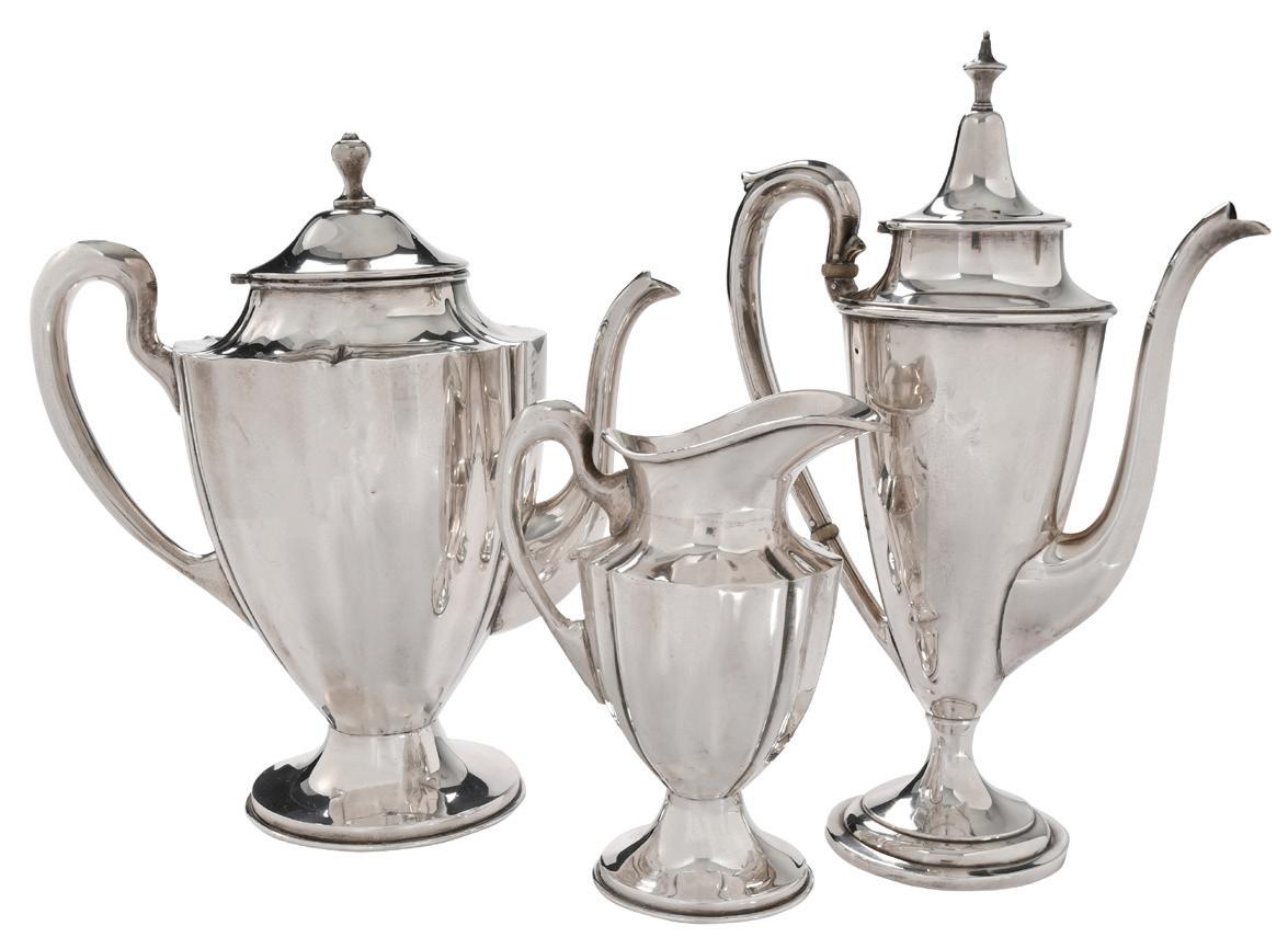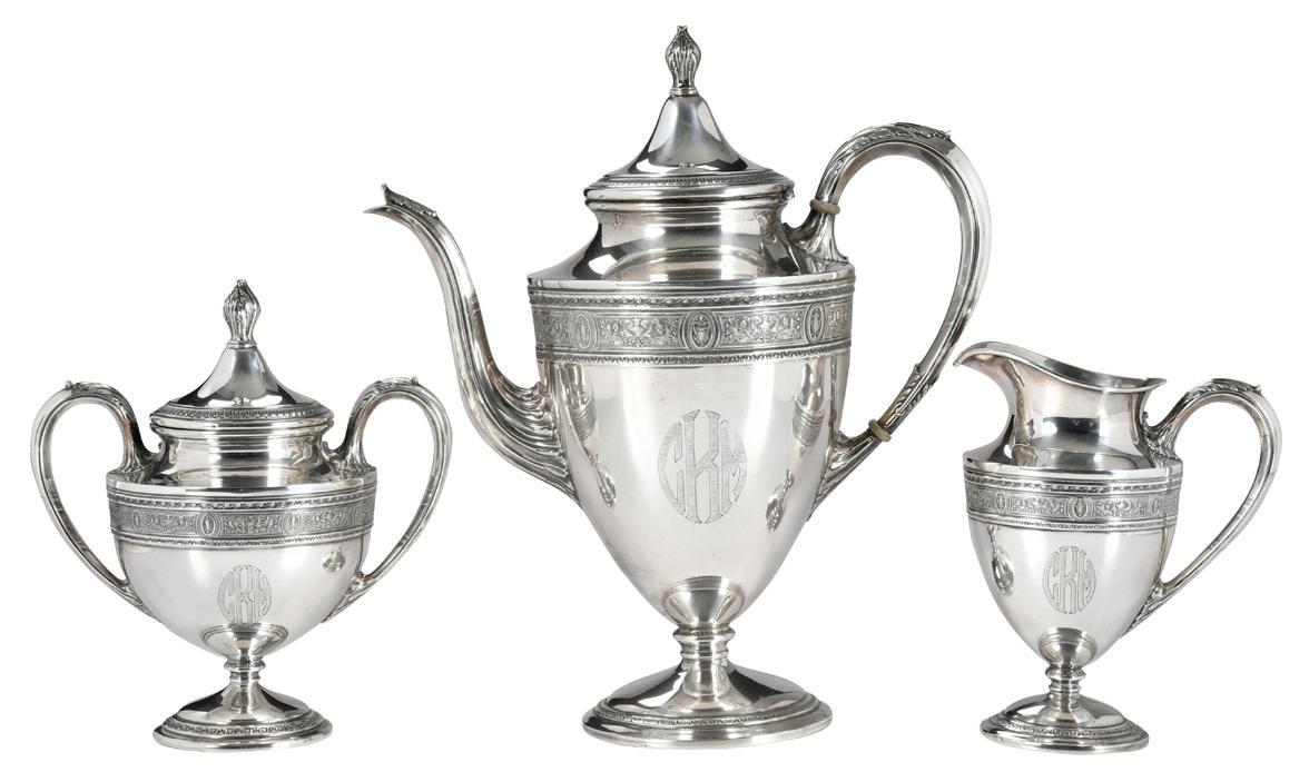 American, 20th century, band of Neoclassical decoration, composite spacers, monogram, marks for International, 42.69 oz. T., 11-3/4 in. coffee pot with matching covered sugar, and creamer, light scratches and typical wear