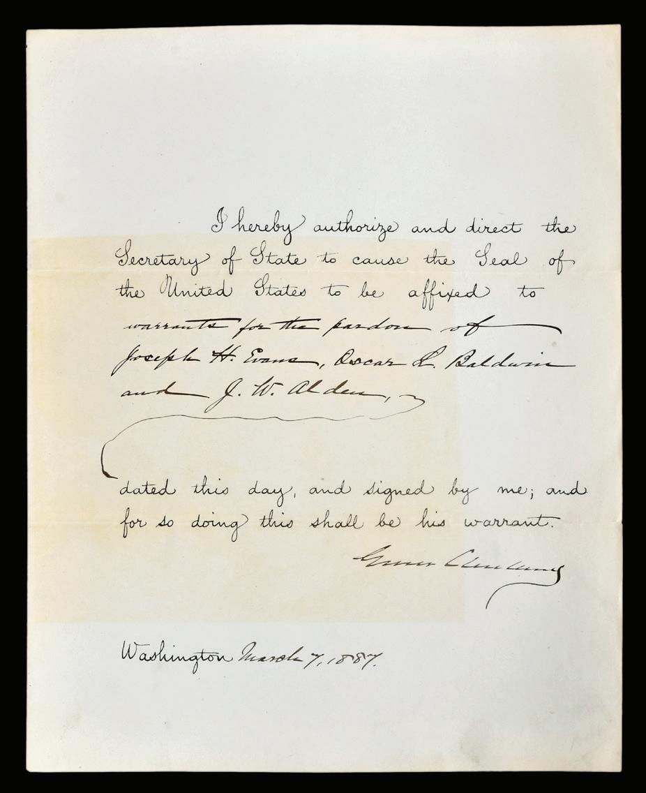 Grover Cleveland Signed Official Decree For Pardon for Joseph H. Evans, Oscar L. Baldwin, and J.W. Aldeen, dated March 7, 1887, signed “Grover Cleveland”, folio, 10 x 8 in. (folded), discoloration, folds, minor split at top center fold, minute losses at fold intersections