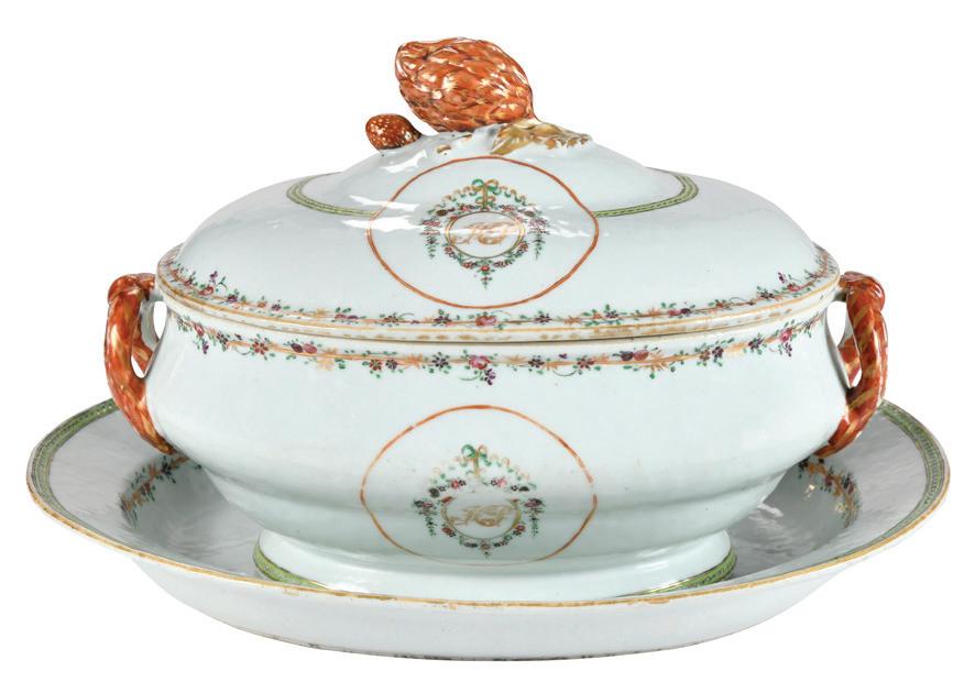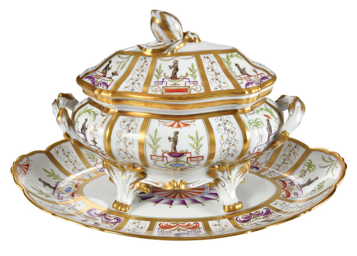 Tiffany & Co. Cirque Chinois Porcelain Tureen and Undertray circa 1990-2001, inscribed “Tiffany and Co. / Private Stock / Hand Painted / Made in Paris” on bases, tureen 7-3/4 x 10 x 5-1/2 in., undertray 2 x 13-5/8 x 9-3/8 in., undertray with some scratches and minor losses to gilding from where tureen rests, typical light wear to base, otherwise good overall