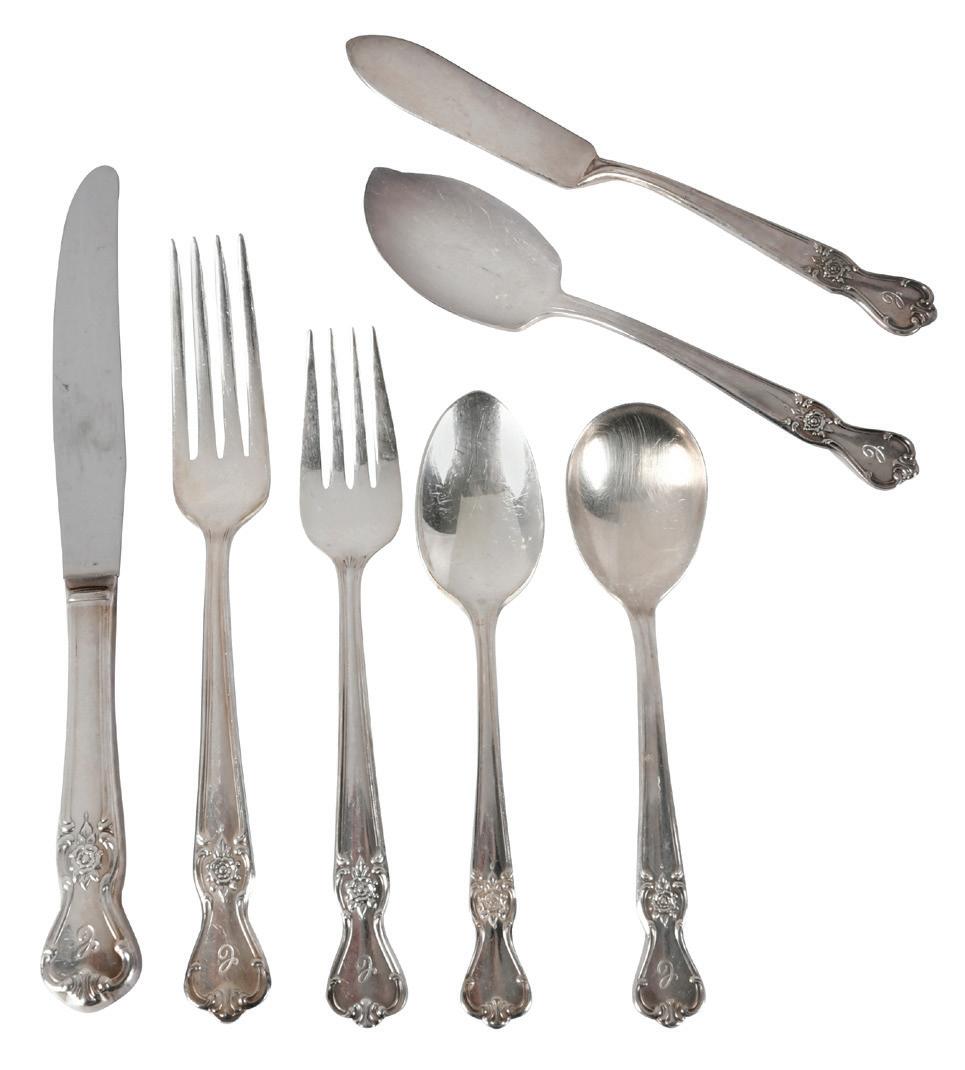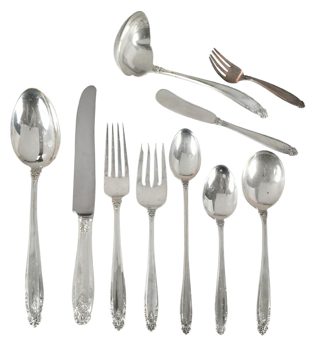 American, 20th century, including 27 hollow handle knives; 14 forks, (three in original bags); 23 salad forks, (two in original bags);three teaspoons; two serving spoons; slotted serving spoon; tomato server; serving fork; cocktail fork; hollow handle spreader with sterling blade; hollow handle butter knife; ladle, no monograms, all with marks for Towle, 77.48 oz. T. excluding hollow handle pieces, average wear