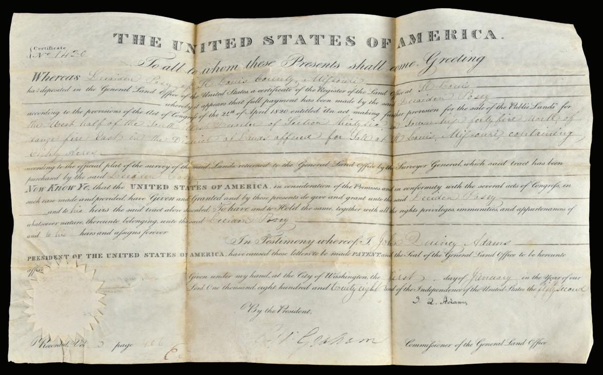 John Quincy Adams Signed Land Grant 1828, issued to Leeaiden Posey of St. Louis County, Missouri, signed “J.Q. Adams”, 9-1/2 x 15-1/2 in., folds, foxing, staining, pinholes, mild surface grime