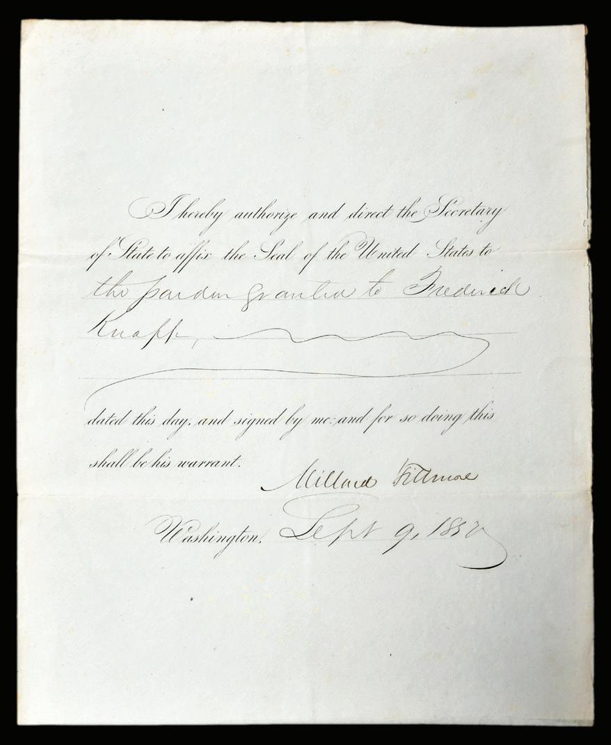 Millard Fillmore Signed Official Decree For Pardon issued for Frederick Knapp, dated September 9, 1850, signed “Millard Fillmore”, folio, 10 x 8 in. (folded), toning, minor edge splits