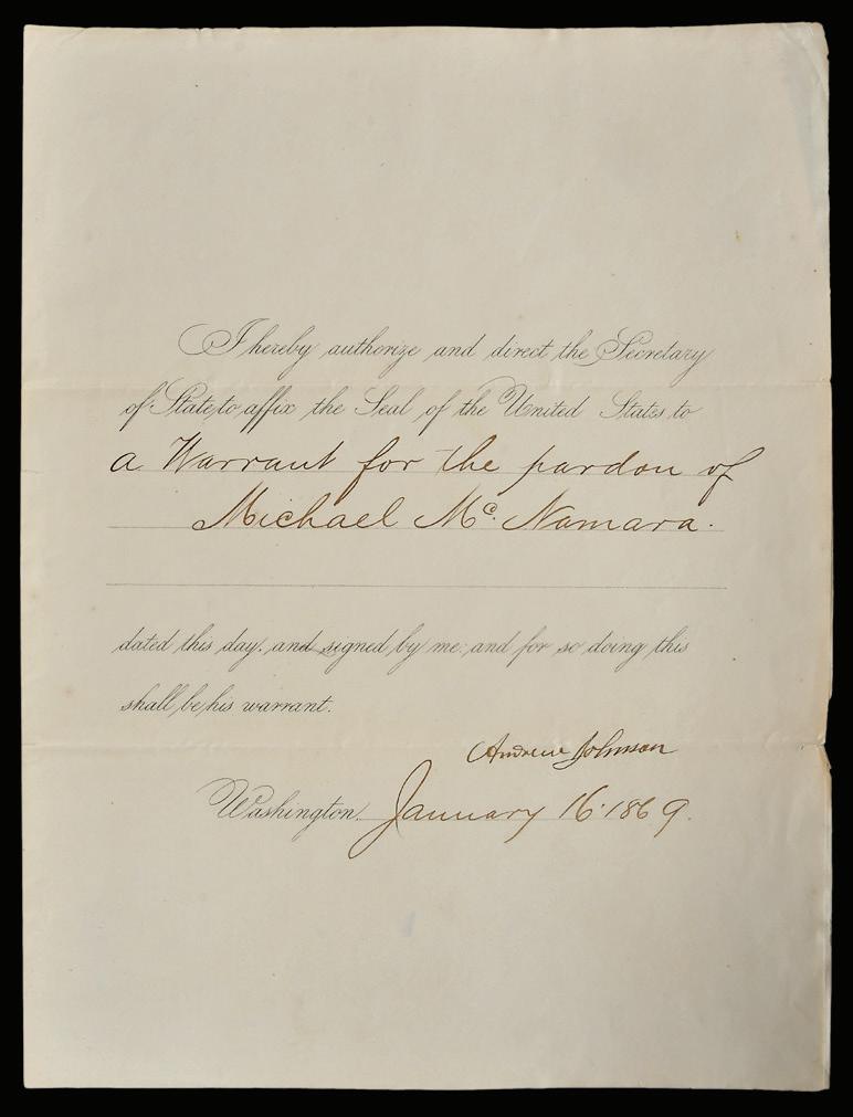 Andrew Johnson Signed Official Decree For Pardon for Michael McNamara, dated January 16, 1869, signed “Andrew Johnson”, folio, 11 x 8-1/4 in. (folded), toning, folds, minor edge splits, isolated incidents of a random pinhole or two