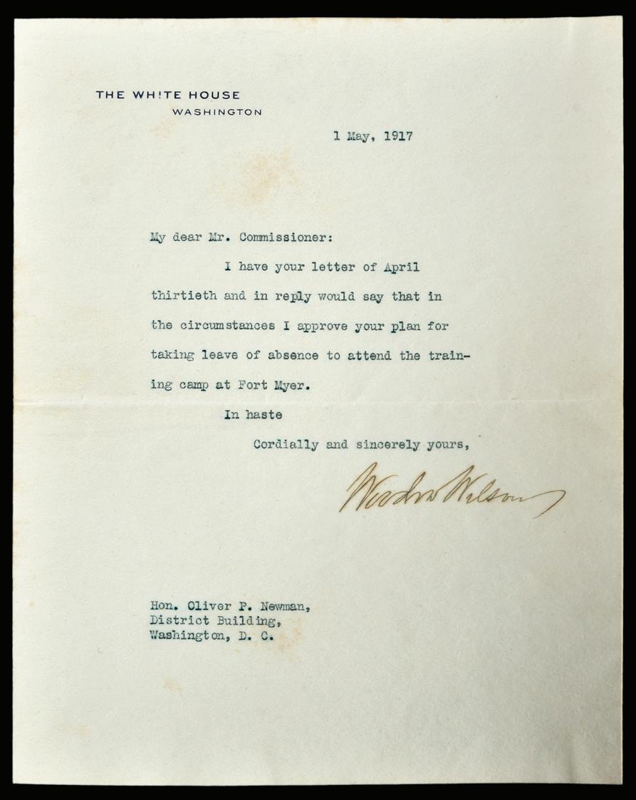Woodrow Wilson Typed White House Letter Signed on official stationery, 1917, to Oliver P. Newman, signed “Woodrow Wilson”, folio, 8-3/4 x 6-3/4 in. (folded), toning, foxing, folds