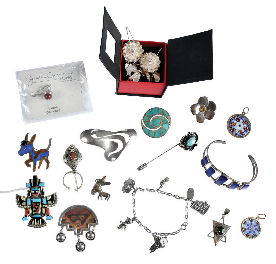 late 19th and 20th century, 11 sterling including match safe; Tiffany (Italian made) pill box; five small round; oval compact; oval case with finger ring; oval case with Mexican coin in lid; rectangular case; four silver plate: shell form small purse; Birks ring box; compact; rectangular box, 1-1/4 in. to 3-3/4 in., all with wear
