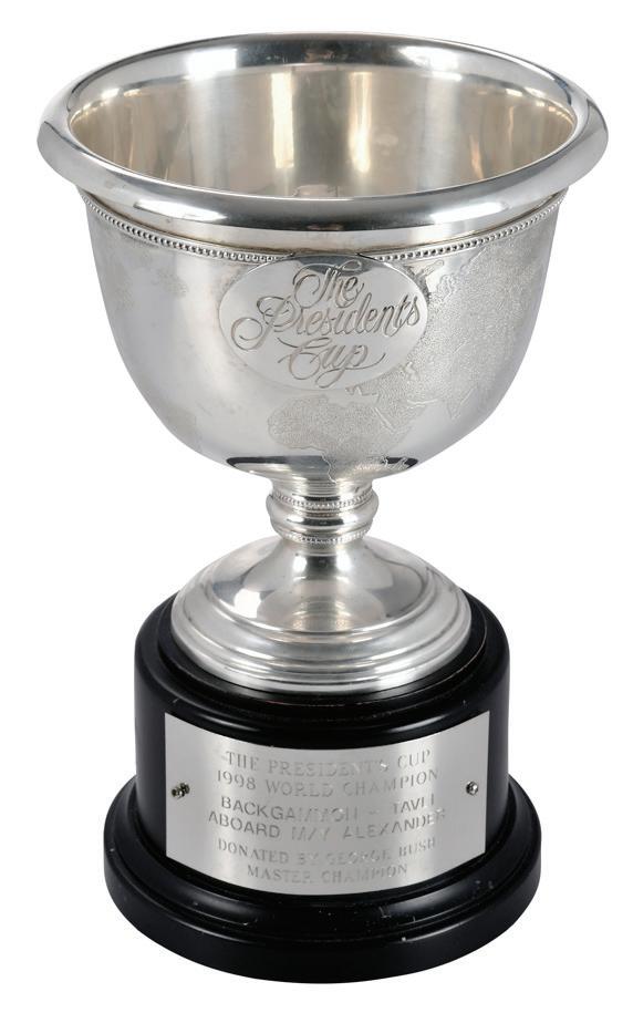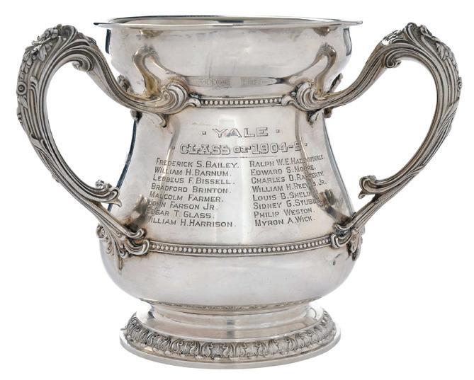 American, late 20th century, Revere style, inscribed “The First American Bank Cup/ Won By/Grace Kitzenbergs/Sailors Dance/May 2, 1987”, marks for Gorham, 27.65 oz. T., 5-3/4 x 11 in., one large dent, top rim dent, small dents, light scratches, and wear