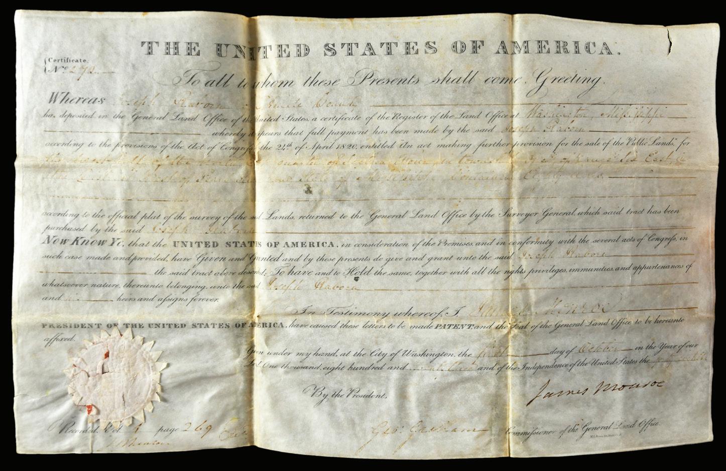James Monroe Signed Mississippi Land Grant 1820, on parchment, issued to Joseph Rabun of Washington, Mississippi, with seal affixed, signed “James Monroe”, 9-1/2 x 15-1/2 in., heavy folds, faint ink (but signature is bold), thin areas, edge splits, isolated holes