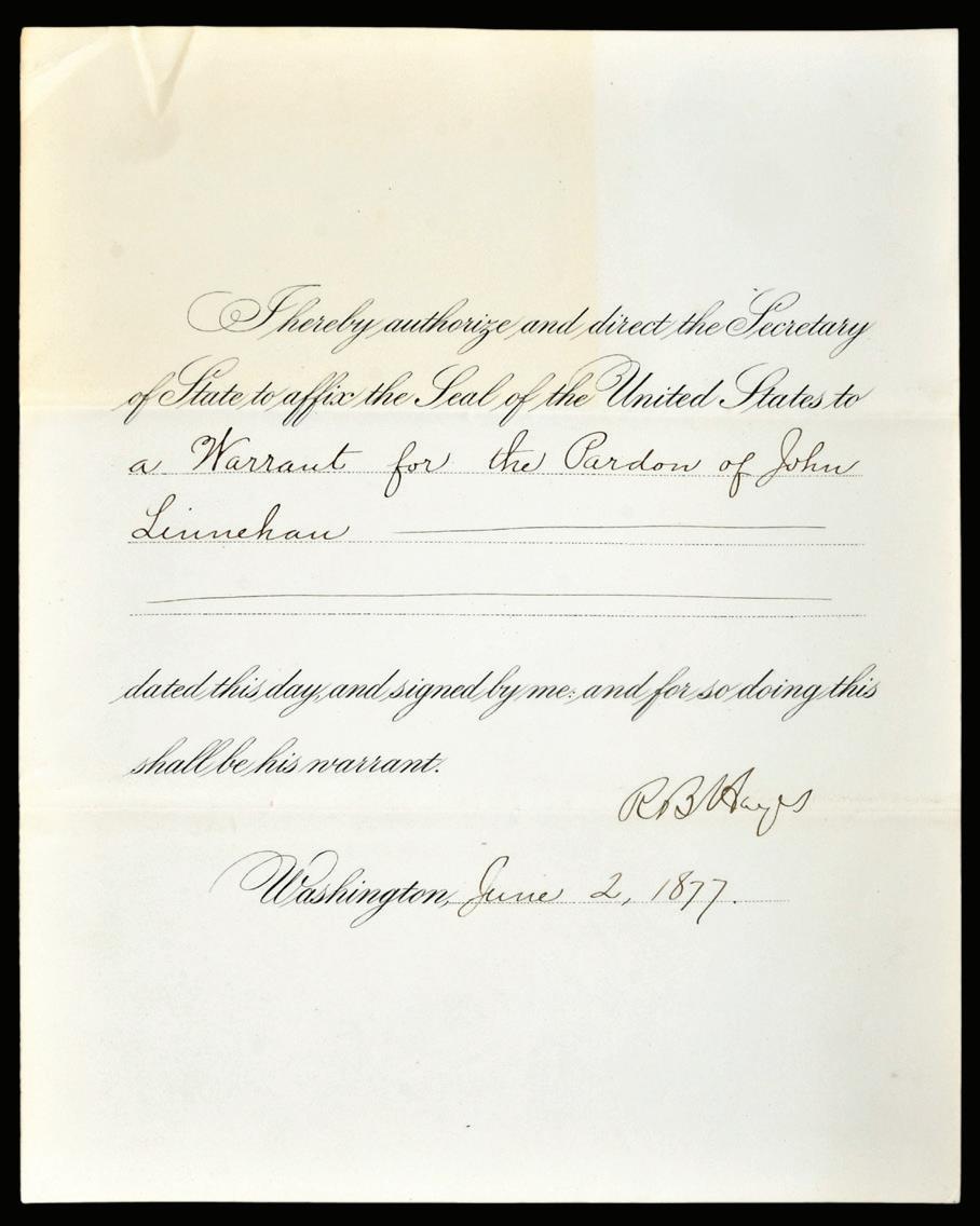 Rutherford Hayes Signed Official Decree For Pardon for John Linnehan, dated June 2, 1877, signed “R.B. Hayes”, folio, 10 x 7-1/2 in. (folded), discoloration, folds, minor split at top center fold, minute losses at fold intersections