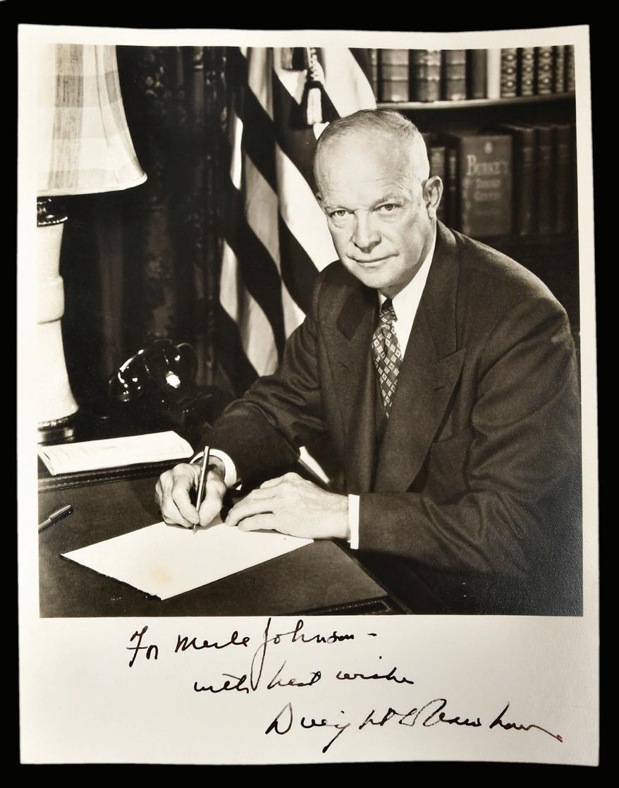 Dwight Eisenhower Signed Photograph black and white photograph, personalized “for Merle Johnson, with best wishes, Dwight Eisenhower”, 10 x 8 in., toning, light creases, dark areas at back (possibly once mounted)