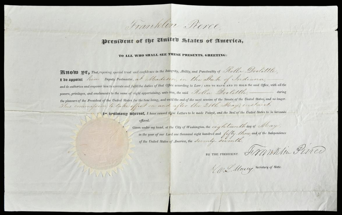 Franklin Pierce Signed Appointment for Rolla Doolittle as Postmaster at Madison, Indiana, 1853, signed “Franklin Pierce”, 10 x 15-1/2 in., toning, folds, split at bottom center, minor losses at fold intersections, older repair at back