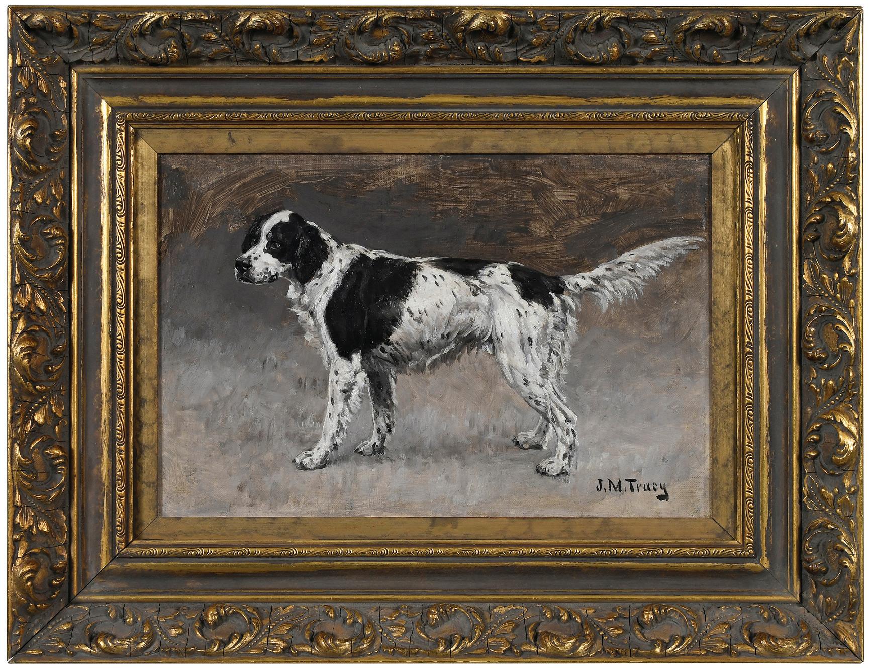 English Setter, signed lower right “J.M. Tracy”, also inscribed in pencil lower right “38”, oil on canvas, 10-1/8 x 15 in.; reproduction gilt wood frame, 17 x 22 x 3 in., strip lined, also remnants of fiber and glue from prior backing, see photos; frame with wear and abrasions