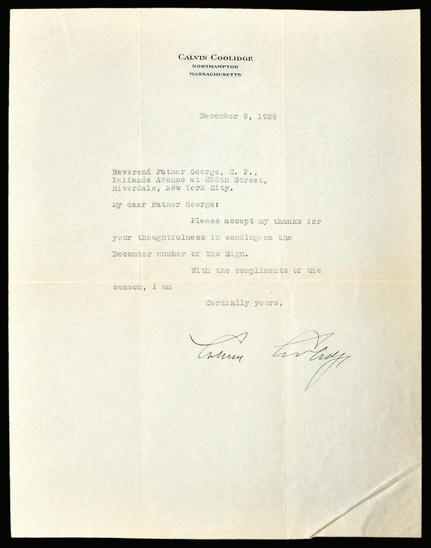 Calvin Coolidge Typed Letter Signed on his personal stationery, 1929, to Reverend Father George of Riverdale, New York, signed “Calvin Coolidge”, 11 x 8-1/2 in., toning, folds