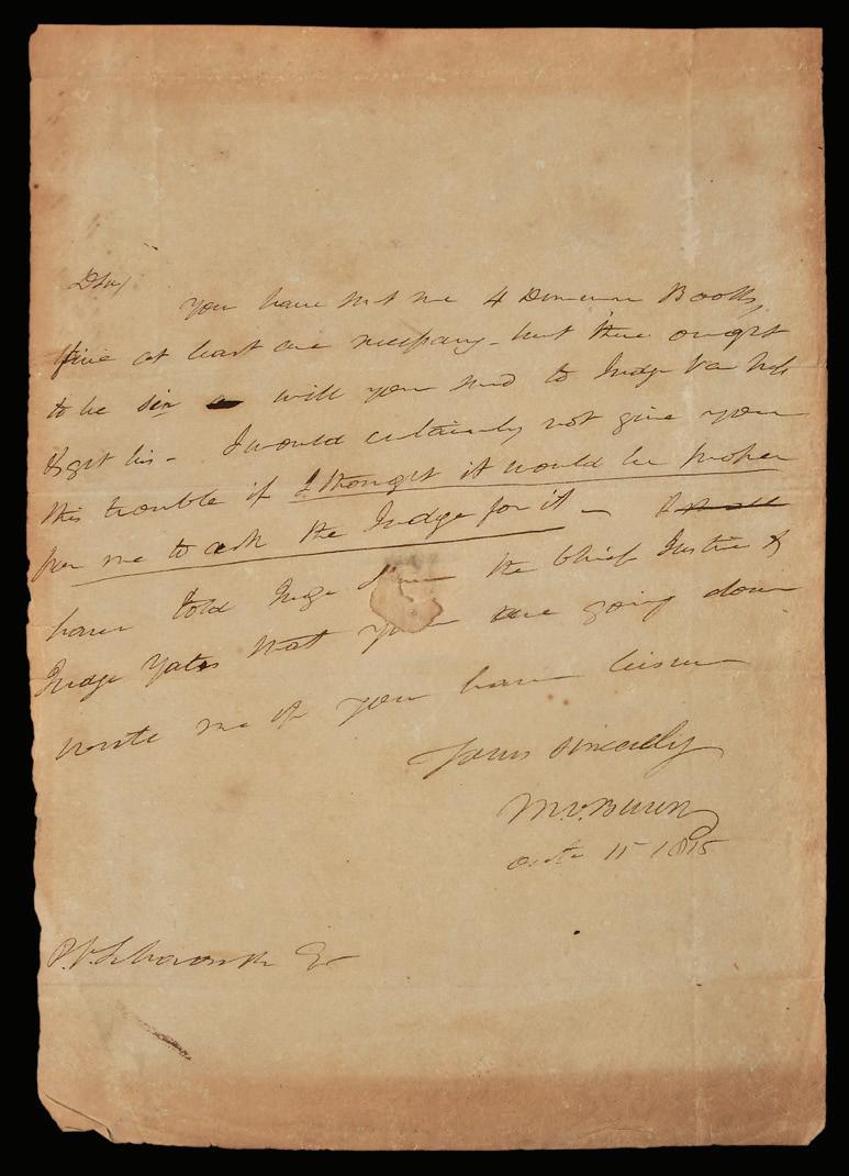 unknown addressee, written with a rushed hand and the intent is unclear, does contain the passage: “I would certainly not give you this trouble if I thought it would be proper for me to ask the judge for it”, signed “M.V. Buren”, 11-1/2 x 8 in., toning, discoloration, periphery wear, crude repair at back to patch a loss
