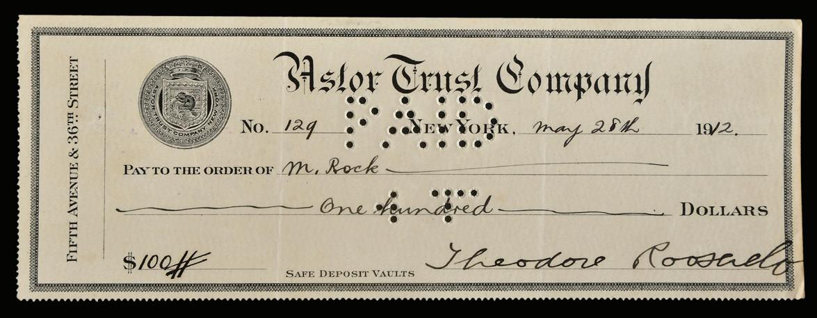$100 check to “M. Rock”, 1912, signed “Theodore Roosevelt”, 3 x 8-1/4 in., light vertical folds, cancellation