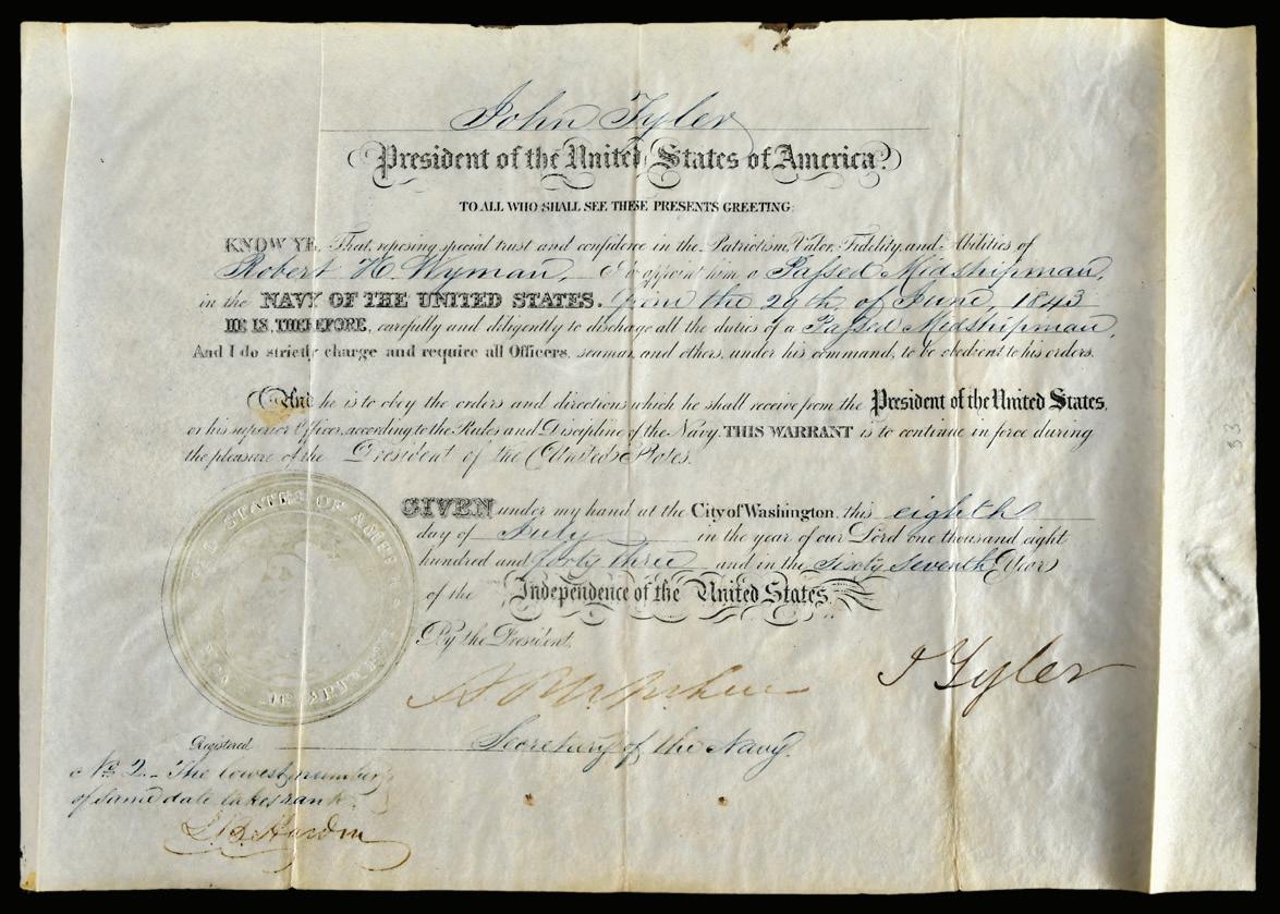 John Tyler Signed Naval Appointment dated 1843, on parchment, to appoint Robert Wyman as Midshipman, with affixed seal, signed “J. Tyler”, 7-1/2 x 11-1/2 in., toning, thin area, edge splits or wear, uneven bottom border