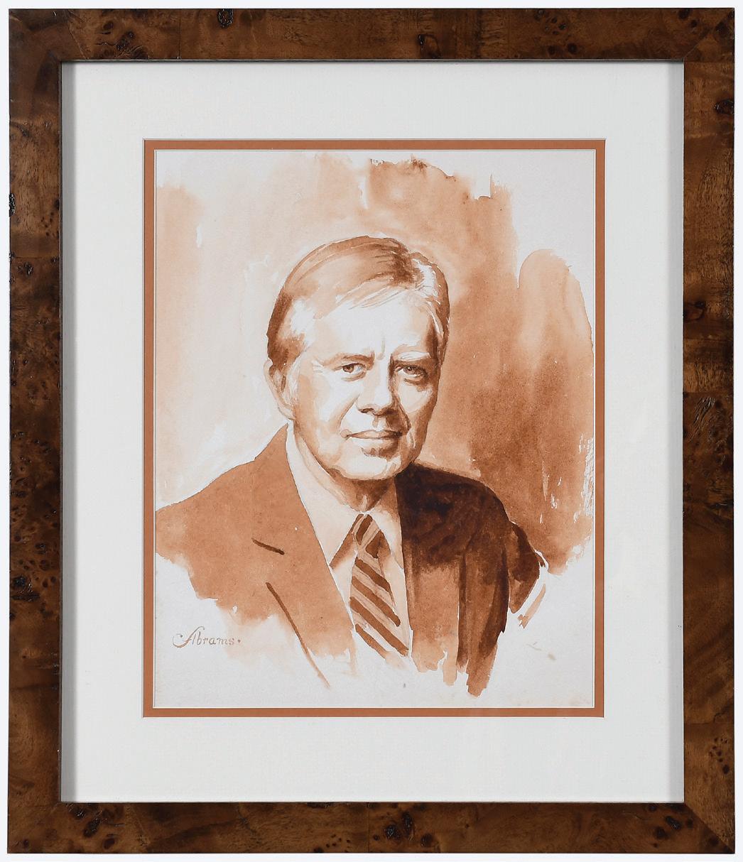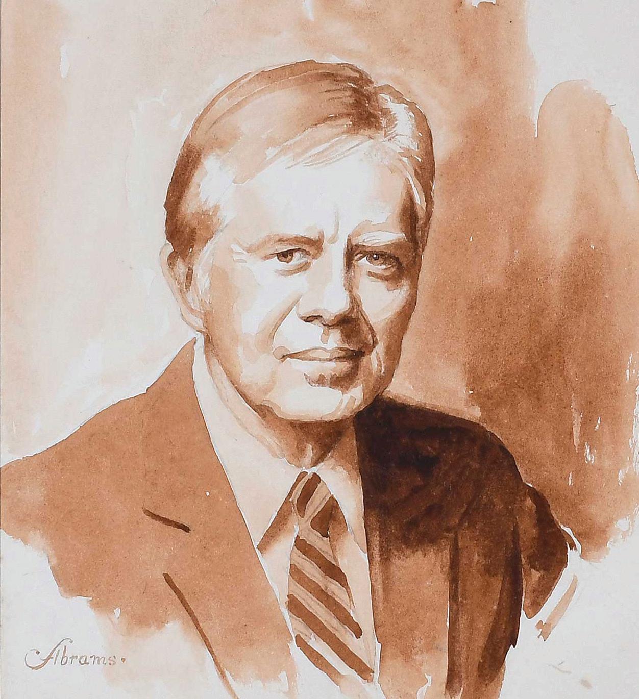 Portrait of President Carter by Herbert E. Abrams (American, 1921-2003) sepia toned watercolor on paper, signed lower left “Abrams”, sight 9-1/2 x 12 in.; modern burl wood frame, 18-1/4 x 15-3/4 x 1 in., not examined out of sealed frame, small tear, barely visible in upper left near edge, slight toning near some edges; frame with slight wear at corners