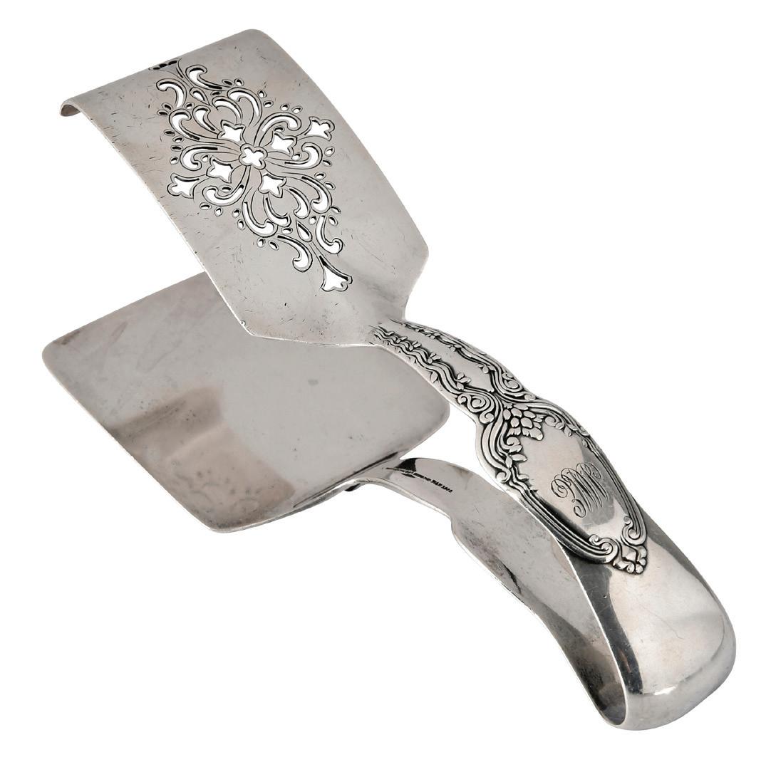 Tiffany Sterling Broom Corn Asparagus Tongs American, 1907-1947, openwork blade, monogram, marks for Tiffany & Co., 6.43 oz. T., 8 in., small dents, scratches and wear