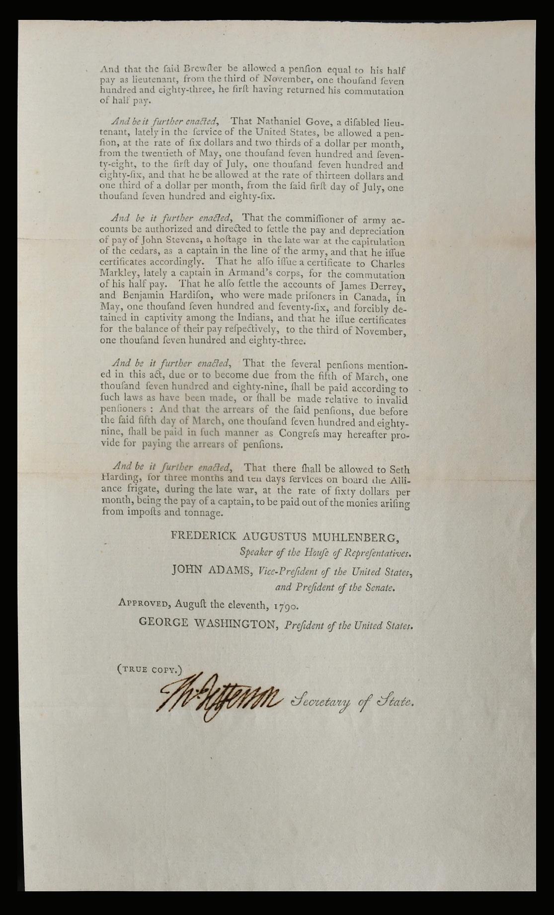 [true copy] record of Congress from January 4, 1790, dealing with an “Act for relief of disabled soldiers...”, signed “Th. Jefferson” as Secretary of State, overall 13 x 7-1/2 in., good overall with a bold look, subtle toning, professionally reinforced folds, side margins possibly once trimmed