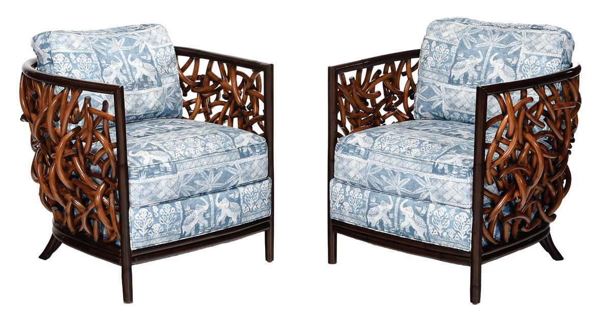 21st century, pole rattan frames, fixed seat cushions and loose back cushion with printed blue on white Indian Elephant motif, 29-3/4 x 34 x 34 in., seat height 20 in., very light wear overall, finish with some scuffs to edges and corners