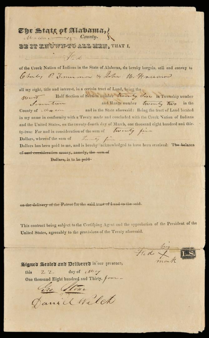 Andrew Jackson Signed Endorsement on Creek Indian / Alabama Document 1834 land conveyance document between a member of the Creek Indian Nation and Charles P. [illegible surname] and John W. Freeman for twenty five dollars, endorsed with signed approval “Andrew Jackson” dated November 1, 1834, 12 x 14-1/2 in., toning, numerous fold reinforcements throughout to counteract paper separations, could possibly benefit from further professional conservation