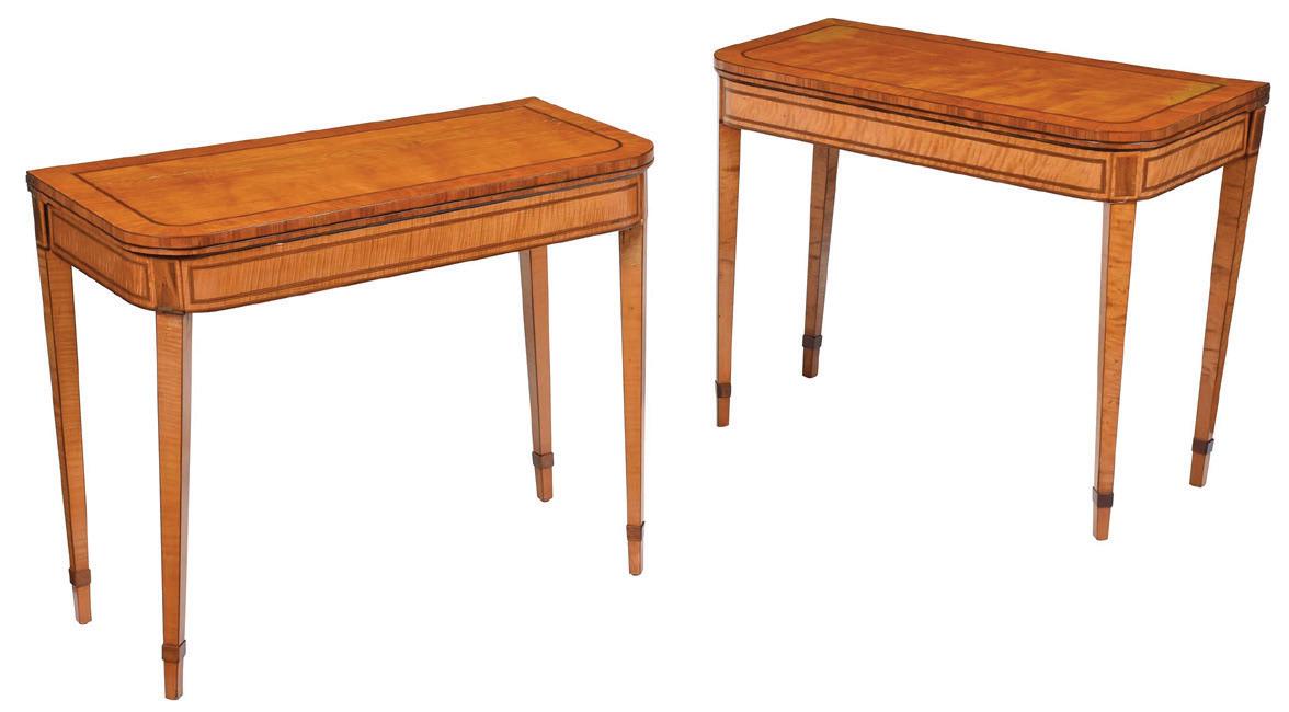 late 18th century, banded foldover top opens to baize lined playing surface, blocked frieze, tapered legs, each with two gate legs, feet with banded molding, 29-1/2 x 35-3/4 x 17-1/4 in. /p>, both tables are overall structurally sound with some looseness at joints, tops with wear including veneer repair, losses, and discoloration, scattered shrinkages throughout, one table with scattered small repairs and losses along frieze and tops of legs, gate legs fit somewhat unevenly when closed, some legs with small veneer repairs, other scattered surface imperfections and other general wear from age and usage