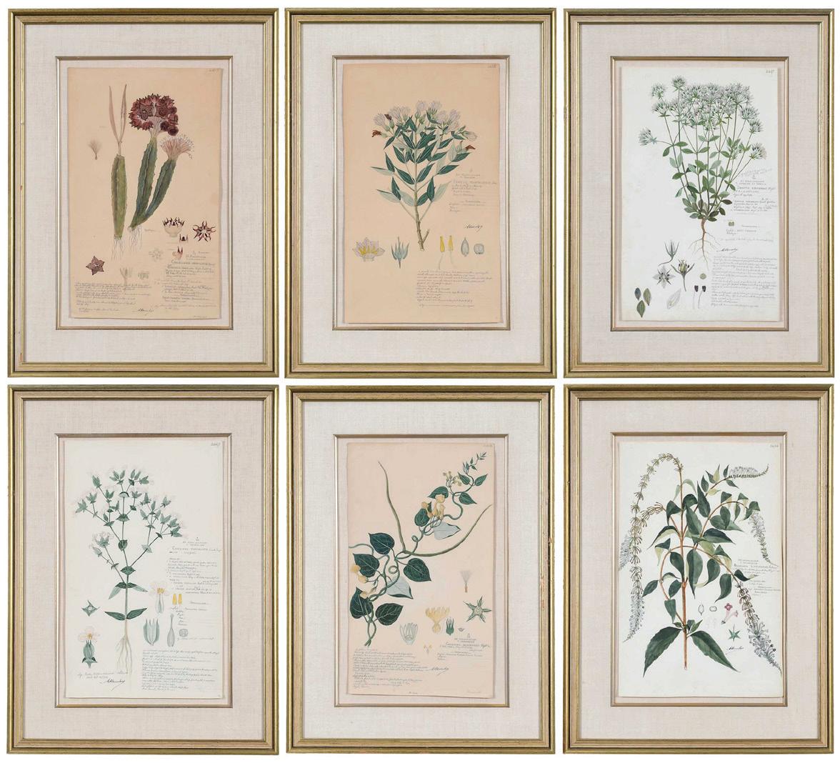 illustrations of botanicals with annotations, signed “A Descubes”, watercolor and pencil on wove paper, varying sizes approximately 17-1/8 x 8-3/4 in.; matching gilt wood frames, 25-3/4 x 18-1/4 x 1-1/8 in., all floated, varying degrees of light toning, some creases, handling smudges, one loose from mount partially, not removed from frames; frames with abrasions