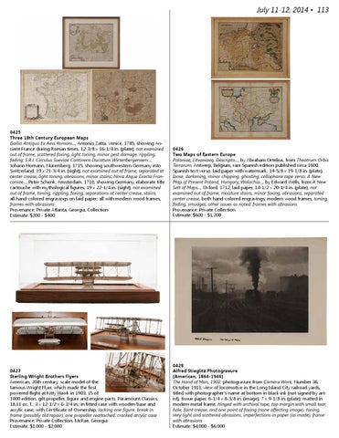 0425 Three 18th Century European Maps Gallia Antiqua Ex Aevi Romani..., Antonio Zatta, Venice, 1785, showing Ancient France during Roman times, 12-3/8 x 16-1/4 in. (plate), not examined out of frame, scattered foxing, light toning, minor pest damage, rippling, fading; S.R.I. Circulus Sueviae Continens Ducatum Wirtenbergensem..., Johann Homann, Nuremberg, 1715, showing southwestern Germany into Switzerland, 19 x 21-3/4 in. (sight), not examined out of frame, separated at center crease, light toning, abrasions, minor stains; Nova Atque Exacta Franconiae..., Peter Schenk, Amsterdam, 1710, showing Germany, elaborate title cartouche with mythological figures, 19 x 22-1/4 in. (sight), not examined out of frame, toning, rippling, foxing, separations at center crease, stains, all hand-colored engravings on laid paper; all with modern wood frames, frames with abrasions Provenance: Private Atlanta, Georgia, Collection Estimate: $200 - $400
