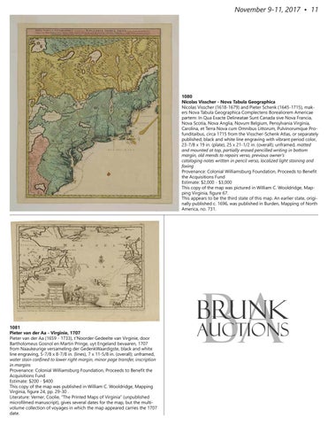 1080 Nicolas Visscher - Nova Tabula Geographica Nicolas Visscher (1618-1679) and Pieter Schenk (1645-1715), makers Nova Tabula Geographica Complectens Borealiorem Americae partem: In Qua Exacte Delineatae Sunt Canada sive Nova Francia, Nova Scotia, Nova Anglia, Novum Belgium, Pensylvania Virginia, Carolina, et Terra Nova cum Omnibus Littorum, Pulvinorumque Profunditaibus, circa 1715 from the Visscher-Schenk Atlas, or separately published; black and white line engraving with vibrant period color, 23-7/8 x 19 in. (plate), 25 x 21-1/2 in. (overall); unframed, matted and mounted at top, partially erased pencilled writing in bottom margin, old mends to repairs verso, previous owner’s cataloging notes written in pencil verso, localized light staining and foxing Provenance: Colonial Williamsburg Foundation, Proceeds to Benefit the Acquisitions Fund Estimate: $2,000 - $3,000 This copy of the map was pictured in William C. Wooldridge, Mapping Virginia, figure 67. This appears to be the third state of this map. An earlier state, originally published c. 1696, was published in Burden, Mapping of North America, no. 731.