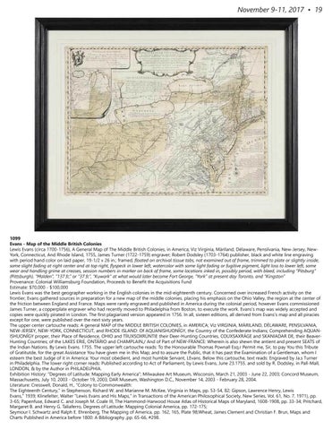 1099 Evans - Map of the Middle British Colonies Lewis Evans (circa 1700-1756), A General Map of The Middle British Colonies, in America; Viz Virginia, Màriland, Dèlaware, Pensilvania, New-Jersey, NewYork, Connecticut, And Rhode Island, 1755, James Turner (1722-1759) engraver; Robert Dodsley (1703-1764) publisher, black and white line engraving with period hand color on laid paper, 19-1/2 x 26 in.; framed, floated on archival tissue tabs, not examined out of frame, trimmed to plate or slightly inside, some slight fading at right center and at top right, flyspeck in lower left, watercolor with some light fading or fugitive pigment, light loss to lower left, some wear and handling grime at creases, session numbers in marker on back of frame, some locations inked in, possibly period, with bleed, including “Pitsburg” (Pittsburgh), “Malden”, “137 fc.” or “37 fc”, “Kuwark” at what would later become Fort George, “York” at present day Toronto, and “Kingston” Provenance: Colonial Williamsburg Foundation, Proceeds to Benefit the Acquisitions Fund Estimate: $70,000 - $100,000 Lewis Evans was the best geographer working in the English colonies in the mid-eighteenth century. Concerned over increased French activity on the frontier, Evans gathered sources in preparation for a new map of the middle colonies, placing his emphasis on the Ohio Valley, the region at the center of the friction between England and France. Maps were rarely engraved and published in America during the colonial period, however Evans commissioned James Turner, a copperplate engraver who had recently moved to Philadelphia from Boston, to execute the work. Evans’s map was widely accepted and copies were quickly pirated in London. The first plagiarized version appeared in 1756. In all, sixteen editions, all derived from Evans’s map and all piracies except for one, were published over the next sixty years. The upper center cartouche reads: A general MAP of the MIDDLE BRITISH COLONIES, in AMERICA; Viz VIRGINIA, MÀRILAND, DÈLAWARE, PENSILVANIA, NEW-JERSEY, NEW-YORK, CONNECTICUT, and RHODE ISLAND: Of AQUANISHUONÎGY, the Country of the Confederate Indians; Comprehending AQUANISHUONÎGY proper, their Place of Residence, OHIO and TÏIUXSOXRÚNTIE their Deer-Hunting Countries, COUXSAXRÁGE and SKANIADAR DE, their BeaverHunting Countries; of the LAKES ERIE, ONTÁRIO and CHAMPLAIN,/ And of Part of NEW-FRANCE: Wherein is also shewn the antient and present SEATS of the Indian Nations. By Lewis Evans. 1755. The upper left cartouche reads: To the Honourable Thomas Pownall Esq.r Permit me, Sir, to pay You this Tribute of Gratitutde, for the great Assistance You have given me in this Map; and to assure the Public, that it has past the Examination of a Gentleman, whom I esteem the best Judge of it in America: Your most obedient, and most humble Servant, LEvans. Below this cartouche, text reads: Engraved by Ja.s Turner in Philadelphia. The lower right corner reads: Published according to Act of Parliament, by Lewis Evans, June 23.1755. and sold by R. Dodsley, in Pall-Mall, LONDON, & by the Author in PHILADELPHIA. Exhibition History: “Degrees of Latitude: Mapping Early America”; Milwaukee Art Museum, Wisconsin, March 21, 2003 - June 22, 2003; Concord Museum, Massachusetts, July 10, 2003 - October 19, 2003; DAR Museum, Washington D.C., November 14, 2003 - February 28, 2004. Literature: Cresswell, Donald, H., “Colony to Commonwealth: The Eighteenth Century,” in Stephenson, Richard W. and Marianne M. McKee, Virginia in Maps, pp. 53-54, 82; Gipson, Lawrence Henry, Lewis Evans,” 1939; Klinefelter, Walter “Lewis Evans and His Maps,” in Transactions of the American Philosophical Society, New Series, Vol. 61, No. 7, 1971), pp. 3-65; Papenfuse, Edward C. and Joseph M. Coale III, The Hammond-Harwood House Atlas of Historical Maps of Maryland, 1608-1908, pp. 33-34; Pritchard, Margaret B. and Henry G. Taliaferro, Degrees of Latitude: Mapping Colonial America, pp. 172-175; Seymour I. Schwartz and Ralph E. Ehrenberg, The Mapping of America, pp. 162, 165, Plate 98;Wheat, James Clement and Christian F. Brun, Maps and Charts Published in America before 1800: A Bibliography ,pp. 65-66, #298.