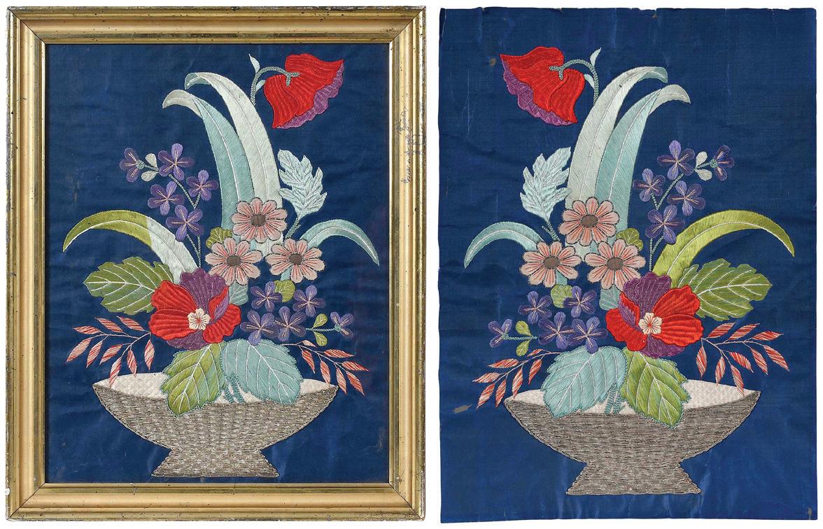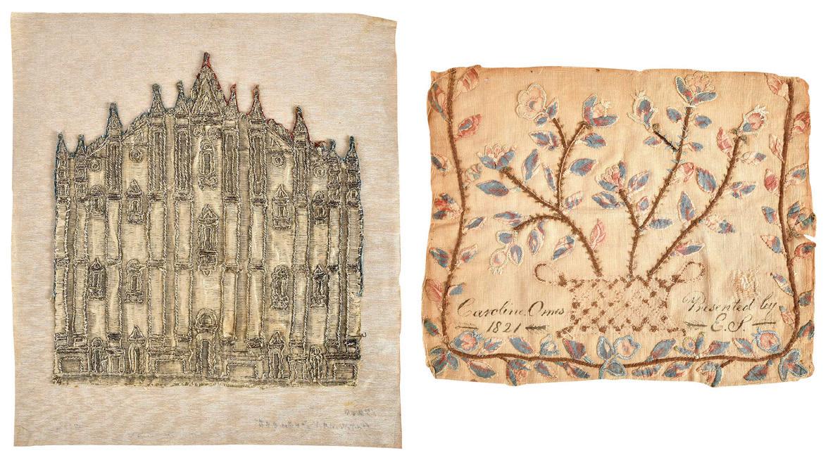 Two Applique Fragments, Cathedral and Flowers comprising: Caroline Omes floral fragment, dated and inscribed “Caroline. Omes/1821/Presented by E.S.”; needlework fragment of the Cathedral of Milan, Italian; largest 12-1/8 x 10-3/4 in., some fraying at edges of backings, some picked, pulled, and loose threads, some discoloration; Omes fragment with repair near right corner, notable discoloration, some holes to backing and loss to stitching; Cathedral example with some wear at edges of applique
