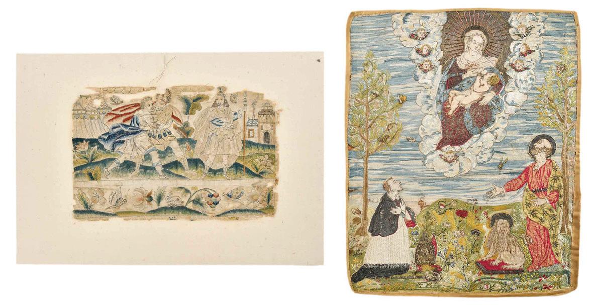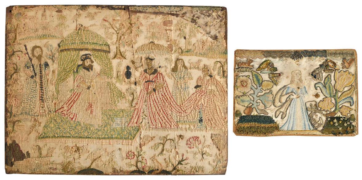 Italian, scene featuring Madonna and Child, silk, metallic, and cotton thread on linen, 14-1/4 x 11-3/4 in.; English, Jacobean biblical or allegorical scene with three figures, silk needlework affixed to later backing, overall 11 x 16 x 1/8 in., Madonna and Child example with loose threads near face of Mary, small hole and patch to lower center, possibly later border; Jacobean example with some notable loss to silk backing at top edge, some shattering and holes