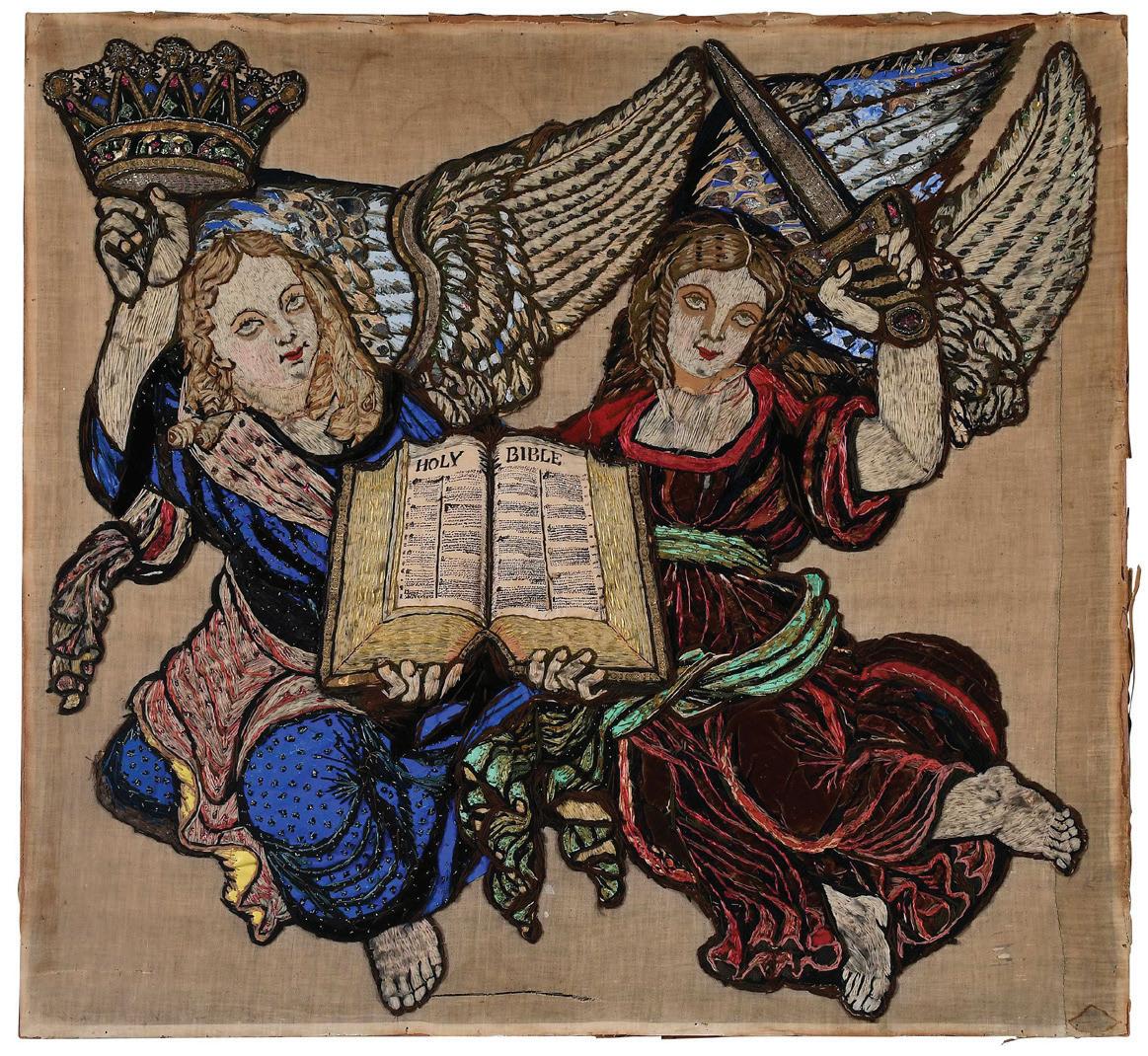 Applique Fragment, Angels with Bible late 19th/early 20th century, possibly American, linen, silk, wool, paper, possibly human hair, on wood stretcher, 35 x 38 x 1 in., tacked at edges, tears and fraying at edges, large tear to lower center, some some staining and holes to linen backing, some looseness and loss to stitching