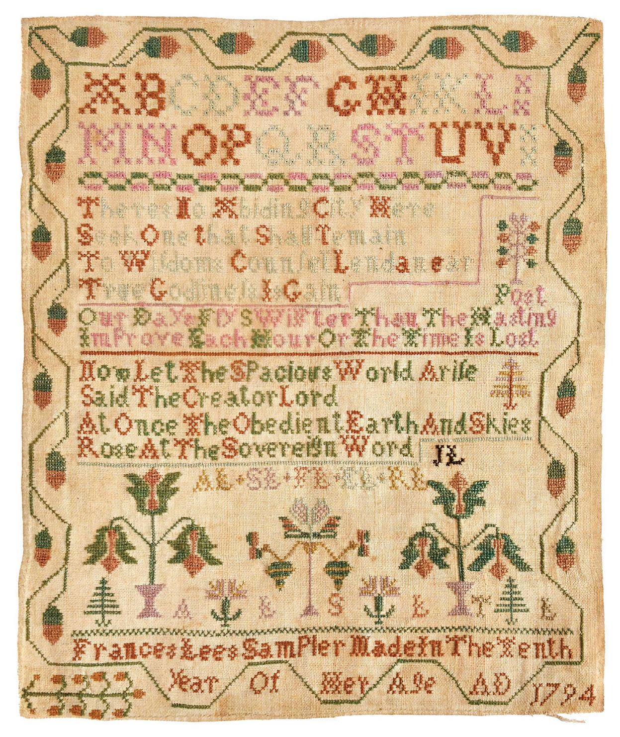Philadelphia Silk on Linen Needlework Sampler, Frances Lee Philadelphia, Pennsylvania, signed and dated “Frances Lees Sampler Made In The Tenth Year Of Her Age AD 1794”, with alphabet, three verses, initials of family members, and floral motifs enclosed in a strawberry border, cross and square eyelet stitches, 13 x 10-1/2 in.; unframed, slight toning of linen, no fading of embroidery, slight fraying to bottom edge of fabric