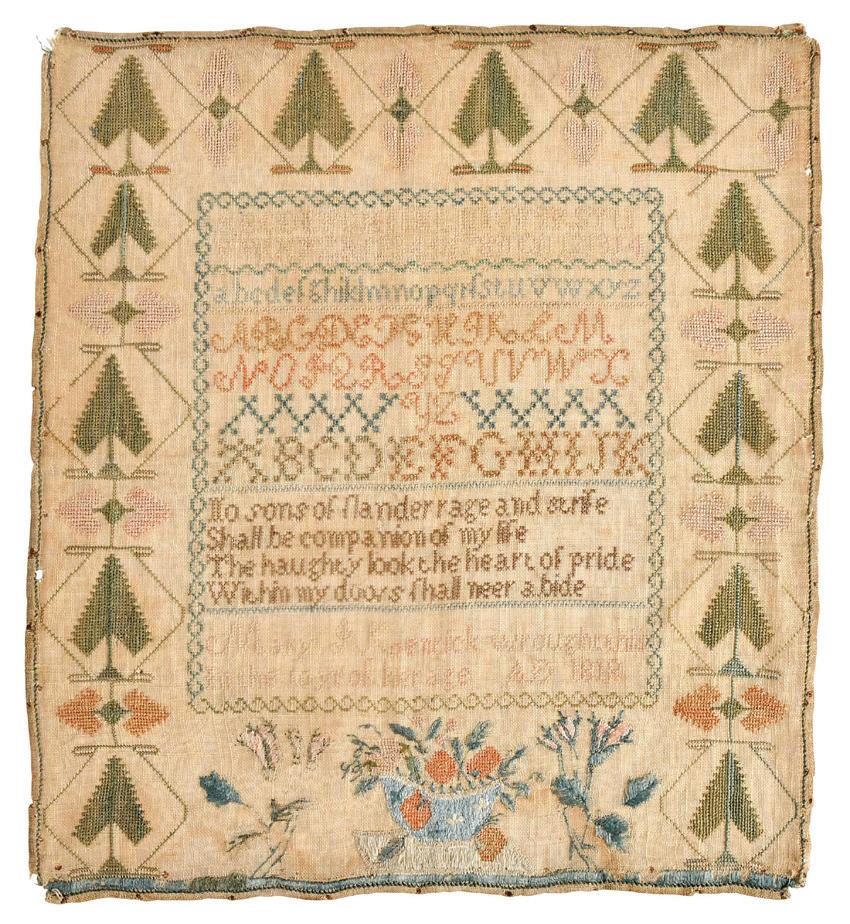 signed and dated “Mary J Koenick wrought this in the 10th yr of her age AD 1818”, with alphabets, a verse, roses flanking a bowl of strawberries bordered on three sides with bold trees, silk on linen, cross, satin, square eyelet, and crossed corner stitches, 18-1/2 x 17 in.; unframed mild fading to embroidery, lacking stitches in left rose spray, linen corners frayed, nail holes along linen edges