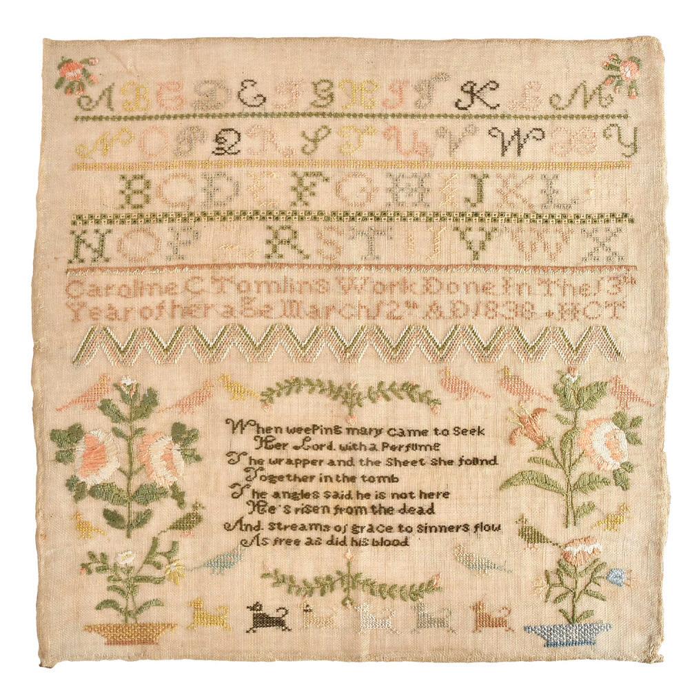 signed and dated “Caroline C. Tomlin’s Work Done In The 13th Year of her age March 12 AD 1838”, with alphabets, verses, decorative bands, floral motifs, birds and a row of differently colored dogs, crinkled and twisted silk on linen, cross, Irish, eyelet and square eyelet stitches, satin, 17-3/4 x 18 in.; unframed, fading to colors, some slight discoloration and staining, some loss to stitching, notably at alphabet, otherwise good condition